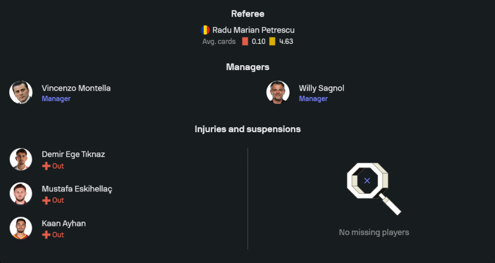 ลูกทีมของ วินเชนโซ่ มอนเตลล่า ไม่มีปัญหาเจ็บแบนเพิ่มเติมจากเกมถล่มบัลแกเรีย 6-1 ความมั่นใจมาเต็ม คาดว่ายึดแกนหลักเดิมทั้งหมด แดนหน้าจัด เคเรม อัคตูร์โคกลู ยืนหอกค้ำ มีสามตัวรุกปั้นเกมอยู่ด้านหลังทั้ง อาร์ด้า กูเลอร์ (เพลย์เมกเกอร์), เคนาน ยิลดิซ (ซ้าย) และ โอกุซ อายดิน (ขวา) คู่กลางคุมจังหวะเป็น ฮาคาน ชาลาโนลู ผสาน ออร์คุน ค็อกคู แนวรับใช้ เซกี เชลิก, เมรีห์ เดมิรัล, อับดุลเคริม บาร์ดัคชี่, เฟร์ดี้ คาดิโอกลู เฝ้าเสาเป็น อูกูร์ชาน คากีร์ โครงสร้างชุดนี้เด่นที่การเพรสซิ่งหนักและสปีดสวนกลับเร็ว หากจูนจังหวะขึ้นเกมติด ถือเป็นทีมที่คมและโหดมากในบ้าน
