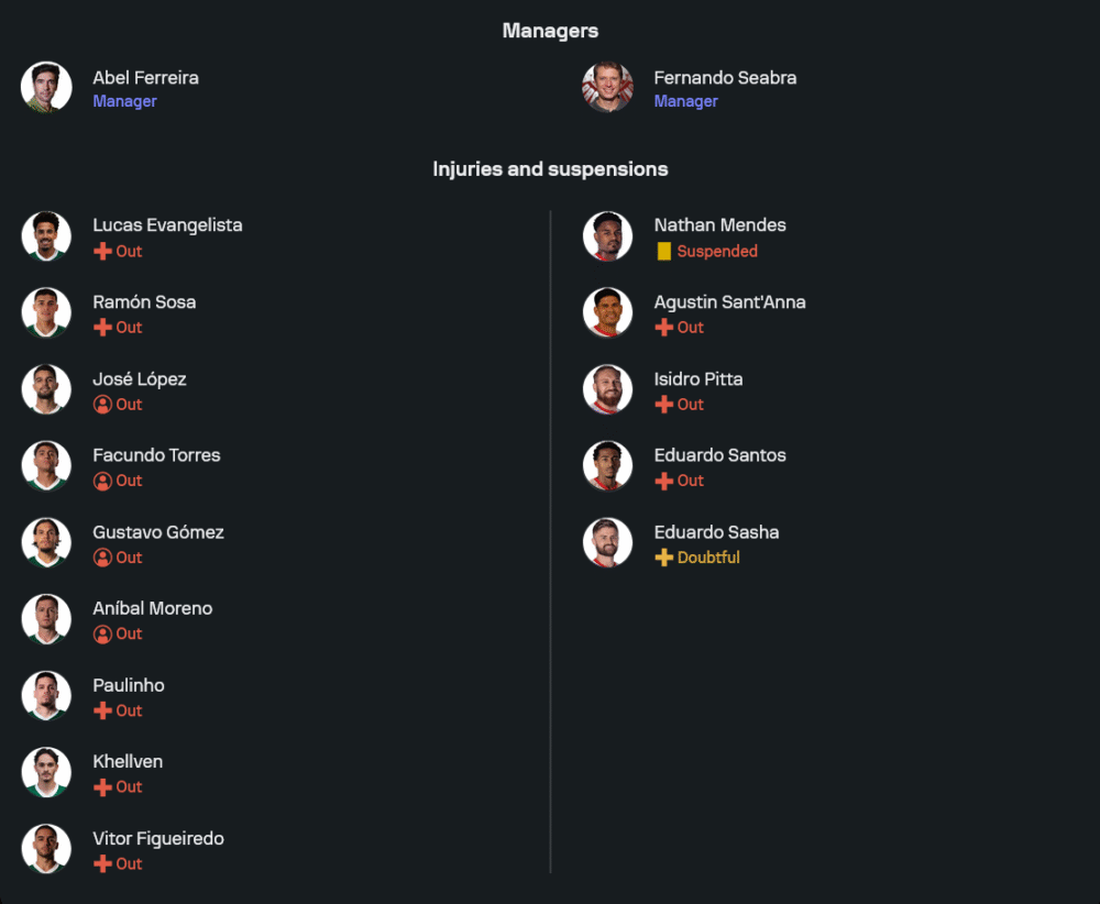 ลูกทีมของ อาเบล เฟร์เรร่า ยังคงร้อนแรงไม่หยุด หลังคว้าชัยมา 3 นัดติดและยิงรวมถึง 10 ประตูในช่วงดังกล่าว แม้จะมีปัญหาเรื่องอาการบาดเจ็บของตัวหลักหลายราย ไม่ว่าจะเป็น รามอน โซซ่า, เคลล์เวน, เปาลินโญ่, ลูคัส เอวานเจลิสต้า, และ ฟิเกเรโด้ แต่ทีมยังคงแข็งแกร่งเพราะมีขุมกำลังลึกและเล่นระบบ 3-4-2-1 ได้อย่างลงตัวแนวรุกใช้ เมาริซิโอ กับ เฟลิเป้ อันแดร์ซอน ปั้นเกมอยู่หลังหัวหอกดาวรุ่งฟอร์มแรง วิตอร์ โรเก้ ที่พร้อมซัดประตูต่อเนื่องในถิ่นอัลลิอันซ์ ปาร์เก้