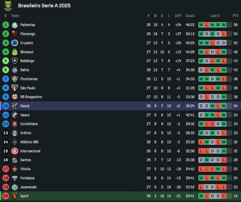 กังเปโอนาตู บราซีเลย์รู แซรียีอา คืนวันพฤหัสบดีที่ 16 ตุลาคม 2568 เตรียมระอุเมื่อ สปอร์ต เรซิเฟ่ ทีมอันดับ 17 เปิดรังต้อนรับการมาเยือนของ เซอาร่า ทีมอันดับ 9 ในเวลา 06:00 น. ที่สนาม เอสตาดิโอ อเดลมาร์ ดา คอสต้า คาร์วัลโญ่ เกมนี้ไม่ใช่แค่ศึกธรรมดา แต่เป็นแมตช์สำคัญที่ทั้งสองทีมต่างต้องการชัยชนะเพื่อเป้าหมายที่แตกต่างกัน เจ้าถิ่นกำลังดิ้นหนีโซนแดง ส่วนผู้มาเยือนมีลุ้นพื้นที่บนตาราง งานนี้ความกดดันสูงและพร้อมเปิดเกมแลกแบบไม่มีถอย ซึ่งใน ตารางบอลวันนี้ ราคาบอลเปิดให้เจ้าถิ่นเป็นฝ่ายต่อ ปป ลบห้า