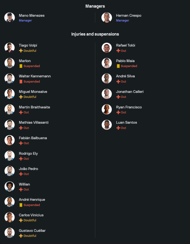 ฝั่งทีมเยือนของกุนซือ เอร์นาน เครสโป ก็มีปัญหาตัวเจ็บเช่นกัน ไล่ตั้งแต่ ราฟาเอล โตลอย, อังเดร ซิลวา, โจนาธาน กาเลรี, ไรอัน ฟรานซิสโก และ ลวน ซานโต๊ส ส่วน ปาโบล ไมอา ติดโทษแบน หมดสิทธิ์ลงสนาม เกมนี้คาดว่าจะมาในระบบ 3-4-1-2 ใช้ ลูเซียโน่ และ เฟร์ไรร่า เป็นคู่หัวหอก โดยมี บัวบาดิญ่า เป็นตัวเชื่อมแดนกลาง ส่วนมิดฟิลด์มี อันโตนิโอ, โซอาเรส, และ ฟรังโก้ ประสานงาน ขณะที่เกมรับยังแข็งแกร่งด้วย อาร์โบเลด้า และ ซาบิโน่ ยืนคุมหลังร่วมกับผู้รักษาประตู ราฟาเอล