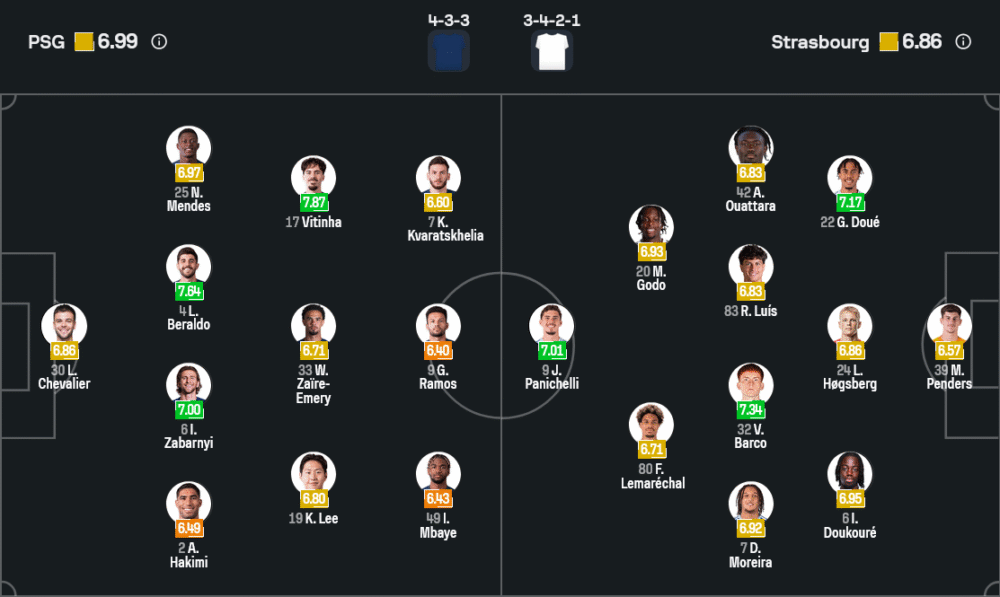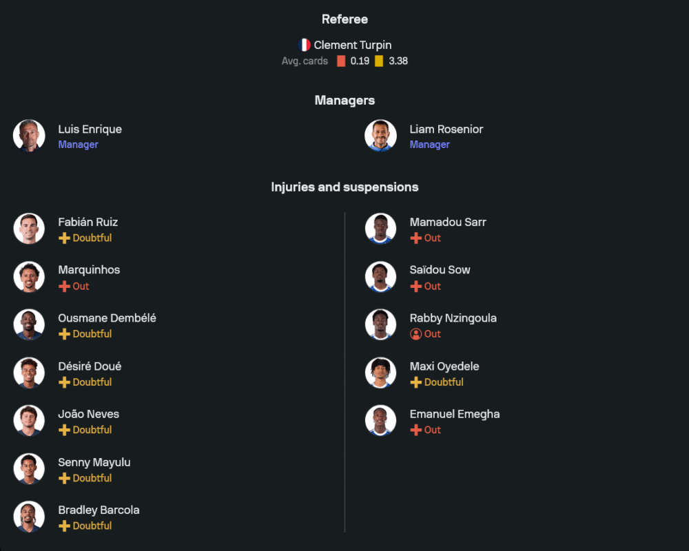 ลูกทีมของ หลุยส์ เอ็นริเก้ จัดทัพชุดแกร่งนำโดย กอนซาโล่ รามอส ยืนหน้าเป้า โดยมี เอ็มบาย และ เอ็นฌานตู คอยกระชากริมเส้น เกมแดนกลางอัดแน่นด้วย วิทินญ่า, ซาอีร์-เอเมรี่ และ อี คัง อิน ที่จะเป็นตัวคุมจังหวะและเชื่อมเกมรุก กองหลังนำโดย อัชราฟ ฮาคิมี่, ซาบาร์นยี, ปาโช่ และ เมนเดส ส่วนผู้รักษาประตูเป็น เชอวาลิเยร์ สภาพทีมมีข่าวไม่ดีเมื่อ มาร์ควินญอส เจ็บชวดแน่นอน ขณะที่ ฟาเบียน รุยซ์, อุสมาน เดมเบเล่, เซนนี่ มายูลู, โชเอา เนเวส และ แบรดลีย์ บาร์โกลา ยังต้องรอเช็กฟิต