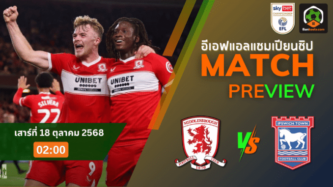 คืนวันเสาร์ที่ 18 ตุลาคม 2568 เวลา 02:00 น. เวที แชมเปี้ยนชิพ อังกฤษพร้อมปลุกอะดรีนาลีนเมื่อ มิดเดิลสโบรห์ เปิดรังริเวอร์ไซด์ สเตเดี้ยม รับการมาเยือนของ อิปสวิช ทาวน์ เกมนี้ราคาเปิดหน้าเสมอ ไร้ต่อรองให้หลบ จะวัดกันที่สมาธิ ความเขี้ยว และรายละเอียดเล็กๆ ตลอด 90 นาที แฟนบอลที่กำลังไถดูโปรแกรมใน ตารางบอลวันนี้ ต้องขีดเส้นใต้คู่นี้เพราะทั้งสองต่างมีแรงจูงใจคนละแบบ เจ้าถิ่นต้องเร่งคืนฟอร์มหลังสะดุดติดๆ ส่วนผู้มาเยือนกำลังแรงจัดกับสถิติไร้พ่ายยาว