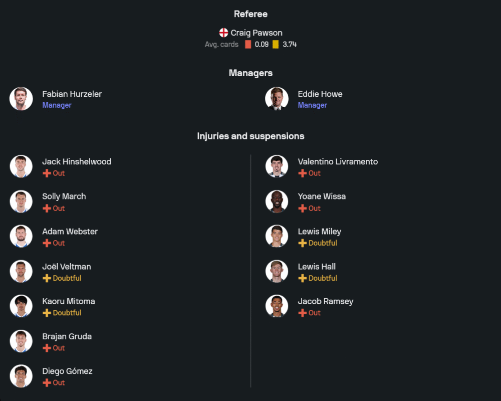 ลูกทีมของ ฟาเบียน ฮูร์เซเลอร์ ยังมีปัญหานักเตะบาดเจ็บหลายราย ไม่ว่าจะเป็น แจ็ค ฮินเชลวู้ด, โซลลี่ มาร์ช, อดัม เว็บสเตอร์, บราแยน กรูด้า และ ดิเอโก้ โกเมซ ที่พลาดลงสนามแน่นอน ขณะที่ โจเอล เวลต์มัน และ คาโอรุ มิโตมะ ต้องรอเช็กความฟิต แต่ขุมกำลังหลักยังครบ เกมนี้ไบรท์ตันจะยึดระบบ 4-2-3-1 มี บาร์ต แฟร์บรู้กเก้น เฝ้าเสา แนวรับนำโดย ลูอิส ดังค์ และ แยน ปอล ฟาน เฮ็คเก้ กลางสนามคุมจังหวะโดย บาเลบา กับ อายารี่ ส่วนแนวรุกใช้ มิโตมะ, มินเตห์ และ กาโดกลู คอยสนับสนุนหัวหอกตัวเป้า แดนนี่ เวลเบ็ค