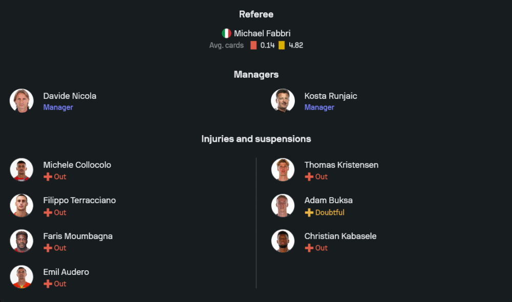 อูดิเนเซ่มีปัญหาผู้เล่นบาดเจ็บอย่าง โธมัส คริสเตนเซ่น และ คริสเตียน คาบาเซเล่ ส่วน อดัม บุคซา ยังต้องรอเช็กความฟิตก่อนลงสนามจริง