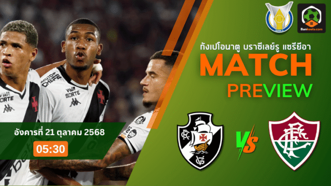 ศึก กังเปโอนาตู บราซีเลย์รู เซเรีย อา คืนวันอังคารที่ 21 ตุลาคม 2568 เวลา 05:30 น. ร้อนเป็นไฟเมื่อ วาสโก ดา กามา เปิดบ้าน เซา จานูอาริโอ้ ต้อนรับคู่อริร่วมเมืองอย่าง ฟลูมิเนนเซ่ เกมนี้ไม่ใช่แค่สามแต้ม แต่คือศักดิ์ศรีของเมืองรีโอเดจาเนโรในแบบที่ไม่มีใครอยากเป็นฝ่ายพลาด ราคาบอลวันนี้ยกให้ทีมเยือนเป็นต่อเล็กน้อย ฟลูมิเนนเซ่ ต่อ ปป แต่ความดุดันของเสียงเชียร์ในรังวาสโกทำให้ดาร์บี้หนนี้พร้อมแตกหักตั้งแต่นาทีแรก แฟนบอลที่ไล่เช็ก ตารางบอลวันนี้ จดคู่นี้ไว้ให้แน่น เพราะมันส์แน่