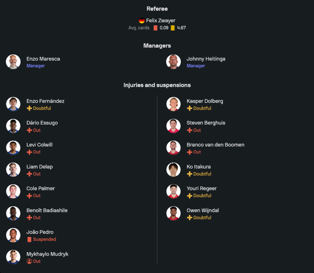 เอนโซ่ มาเรสก้า จูนทีมให้เข้ารูปเข้ารอย ผลงานล่าสุดในลีกกับเกมยุโรปเริ่มกรุยทางได้ดี โดยไลน์อัปจากภาพชุดล่าสุดชัดเจน นายด่านยึด โรเบิร์ต ซานเชซ เฝ้าเสา แนวรับสี่คนประกอบด้วยแบ็กซ้าย มาร์ก กูกูเรญ่า คู่เซ็นเตอร์มี เทรวอห์ ชาโลบาห์ จับคู่ โตซิน อดาราบิโอโย่ ส่วนแบ็กขวาใช้ มาลอ กุสโต คู่กลางวางเครื่องจักรไล่บี้อย่าง มอยเซส ไกเซโด้ ทำงานร่วมกับ อันเดรย์ ซานโตส โซนสามตัวรุกเติมความจี๊ดด้วย เอสเตวาว ทางขวา ตรงกลางเป็น ฟากุนโด บัวโนเต คอยเชื่อมจังหวะ ซ้ายจัดสปีดของ เปโดร เนโต้ ป้อนบอลให้หอกเป้า มาร์ค กีอู ดาวยิงหนุ่มที่สอดมาปิดสกอร์ได้คมกริบ เรื่องตัวเจ็บยังมีหลายรายตามลิสต์ แต่โครงสร้างทีมยังแน่นและยืดหยุ่นพอจะหมุนเวียนได้สบาย