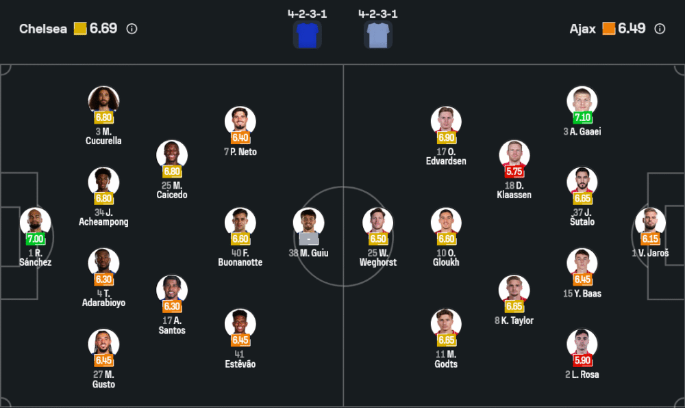 รูปเกมคาดว่าเจ้าบ้านจะคุมบอลเหนือกว่า ใช้ 4-2-3-1 เปิดเพรสสูงตั้งแต่แดนบนแล้วสวิตช์เป็น 2-3-5 เวลาบุกเต็มกำลัง ฟูลแบ็กทั้งสองข้างยืนสูงเพื่อดันเอสเตวาวและเนโต้เข้าไปยืนระหว่างไลน์คู่เซ็นเตอร์ของอาแจ็กซ์ จุดเด่นของเชลซีคือจังหวะเปลี่ยนสปีดในพื้นที่สุดท้ายและความหลากหลายในการเข้าทำ ทั้งบอลคัทแบ็กจากกุสโตหรือการแทงช่องให้กีอูวิ่งทะลุเส้นล้ำหน้า