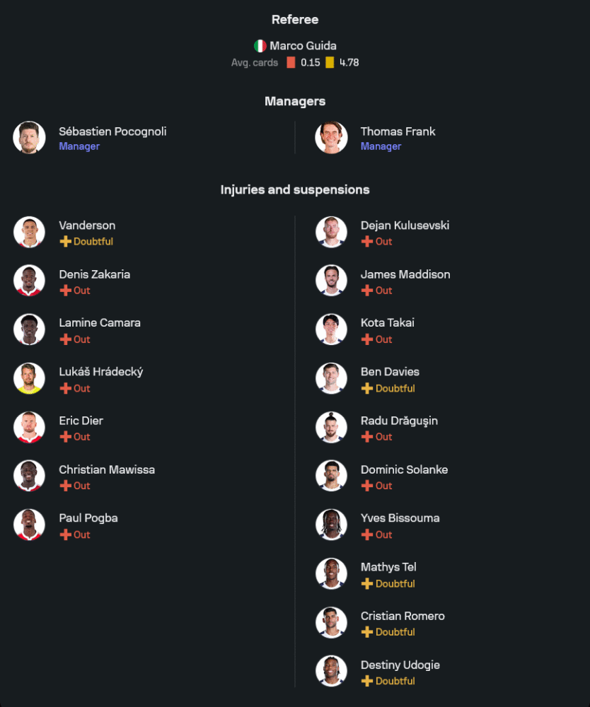 ทัพไก่ของโธมัส แฟรงค์ กำลังบาลานซ์ทีมท่ามกลางอาการเดี้ยงหลายรายตามภาพชุดล่าสุด นายด่านยังเป็น กีเยร์โม่ วิคาริโอ แนวรับขวา เปโดร ปอร์โร่ คู่เซ็นเตอร์ปรับใช้ เควิน ดันโช ประกบ มิคกี้ ฟาน เดอ เฟน ขณะที่แบ็กซ้ายเรียกความเร็วจาก เดนเซล สเปนซ์ คู่มิดฟิลด์วาง ปาเป้ มาตาร์ ซาร์ คุมจังหวะกับ โรดรีโก้ เบนตานคูร์ สามตัวรุกจัด เบรนแนน จอห์นสัน ทางขวา ตรงกลางใช้ดาวรุ่งพลังสด ลูคัส แบร์กวัลล์ และด้านซ้ายเป็น ซาวี ซิมอนส์ ป้อนบอลให้หอกตัวเป้า ริชาร์ลิซอน ขณะที่รายชื่อตัวเจ็บยาวมีเพียบ ทั้ง เดยัน คูลูเซฟสกี้, เจมส์ แมดดิสัน, อีฟส์ บิสซูม่า, โดมินิก โซลันกี้ และ ราดู ดรากูซิน ขณะที่ คริสเตียน โรเมโร่ กับ เดสตินี อูโดกี้ ต้องรอเช็กหน้างาน