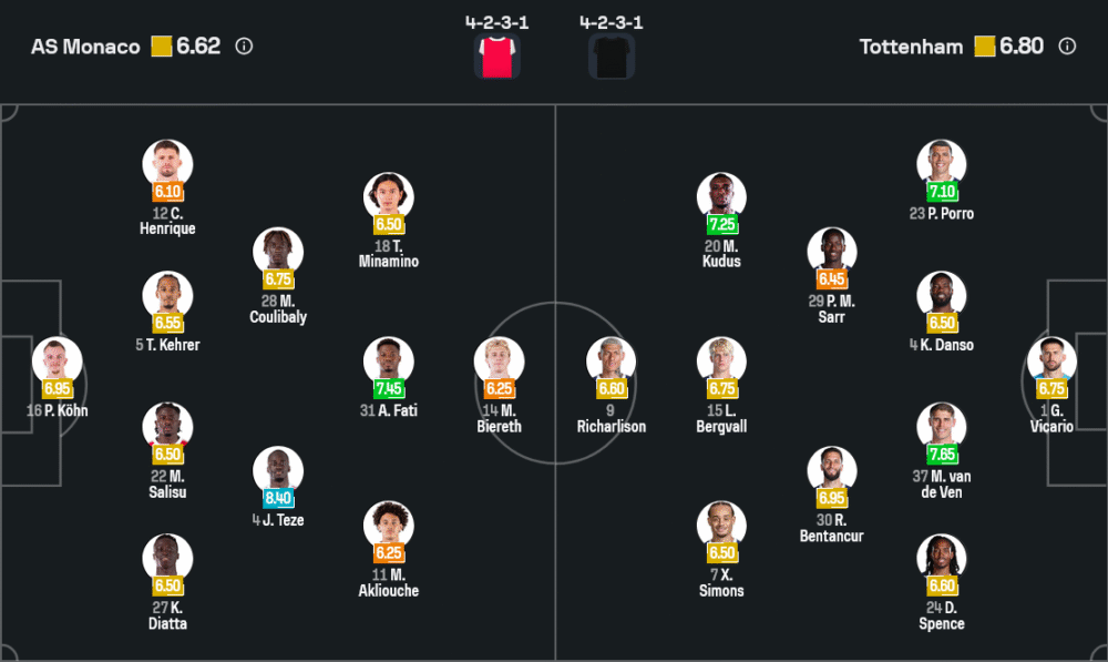 ศึกนี้คือการปะทะของสองทีมเกมรุกอันตราย แต่แนวรับยังมีบาดแผลให้โดนเจาะได้ทั้งคู่ ช่วงต้นเกมคาดว่าสเปอร์สจะพยายามกดเพรสสูง กางทรง 4-2-3-1 แล้วสลับเป็น 2-3-5 ตอนครองบอลบุก ปอร์โร่กับสเปนซ์ดันสูงเพื่อเปิดทางให้ จอห์นสัน และ ซิมอนส์ เข้าทำในครึ่งช่อง (half-space) ขณะที่ แบร์กวัลล์ จะรับบทตัวเชื่อมเกมระหว่างไลน์เพื่อป้อนให้ ริชาร์ลิซอน ปักหลักในกรอบเขตโทษ จุดตัดสินฝั่งไก่คือจังหวะสุดท้าย—ถ้าคมพอ โอกาสบุกยิงนำมีสูง เพราะโมนาโกมักเสียสมาธิในพื้นที่เสาสองและลูกคัทแบ็ก