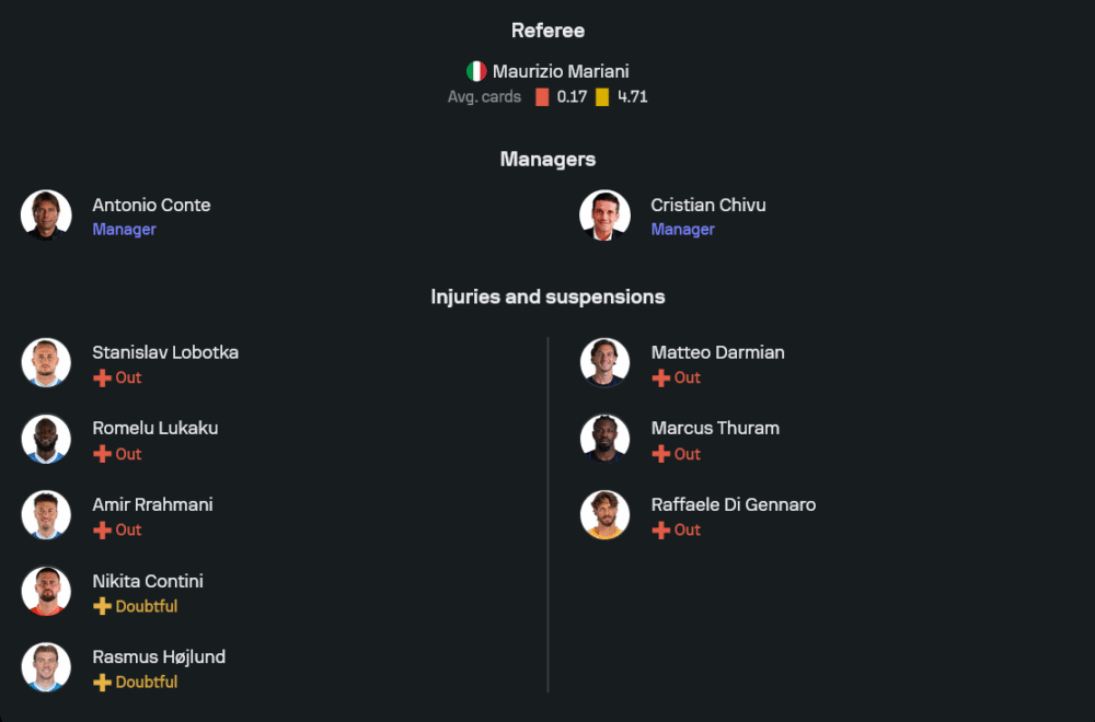 เจ้าถิ่นเพิ่งสะดุดหนักต่อเนื่อง เกมลีกแพ้ โตริโน่ 0-1 ต่อด้วยกลางสัปดาห์นัดยุโรปโดนถล่มจนเสียทรง จุดที่คอนเต้ต้องรีดด่วนคือการทรานซิชันเกมรับที่ช้าและระยะห่างระหว่างไลน์แนวรับกับมิดฟิลด์ซึ่งเปิดช่องให้คู่แข่งสวนหลังบ้านบ่อยเกินไป อย่างไรก็ดี เมื่อเล่นในเนเปิลส์พวกเขายังอันตราย ยิงประตูสม่ำเสมอและสร้างโอกาสได้จากลูกครอสของวิงแบ็กซ้ายขวา