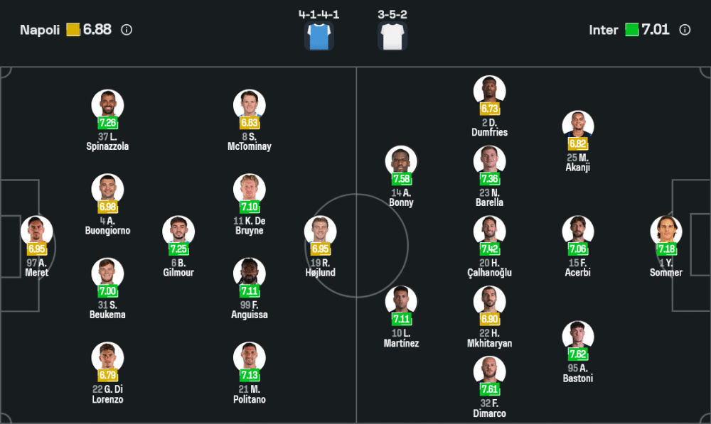 อินเตอร์จะคุมบอลมากกว่า ใช้รูปแบบล้อคกลางสนามและฉีกออกช่องวิงแบ็ก ดุมฟรีส์กับดิมาร์โก้คือกุญแจไขเกม เมื่อมีพื้นที่ โยนมาตรงจุดนัดพบให้ เลาตาโร่ โฉบซัด หรือไหลย้อนให้ มคิตาร์ยาน เติมมายิงสองแถว การดวลกันที่ชี้ขาดคือจังหวะเปลี่ยนจากรับเป็นรุก หากนาโปลีแย่งบอลแล้วปล่อยเร็วให้แนวรุกไหลออกปีก มีสิทธิ์ทิ่มหลังไลน์สามของอินเตอร์ได้เหมือนกัน แต่ถ้าเสียบอลกลางทาง โอกาสโดนสวนกลับแบบคมกริบก็สูงมาก