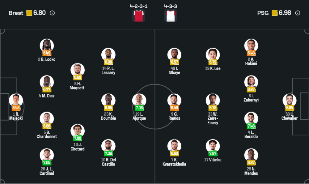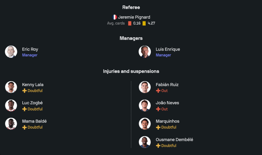 ฝั่งทีมเยือนของ หลุยส์ เอ็นริเก้ มาเต็มในระบบ 4-3-3 โดยมี เชฟวาลิเยร์ ยืนเฝ้าเสา แนวรับประกอบด้วย อัชราฟ ฮาคิมี่, ซาบาร์นี, เบรัลโด้ และ นูโน่ เมนเดส กลางสนามสามตัวที่กำลังเล่นได้อย่างมั่นใจคือ ซาอีร์-เอ็มเมอรี่, วิตินญา และ กอนซาโล่ รามอส ส่วนแนวรุกฝากความหวังไว้ที่ เอ็มบาเย้, คูวารัตส์เชเลีย และ อัชราฟ ฮาคิมี่ ที่พร้อมสอดขึ้นทำเกมรุกตลอดเวลา แม้ทีมจะมีปัญหานักเตะบาดเจ็บอย่าง ฟาเบียน รูอิซ, เจา เนเวส, และ มาร์กินญอส ที่ไม่พร้อม แต่ศักยภาพของตัวจริงยังน่ากลัวสุด ๆ