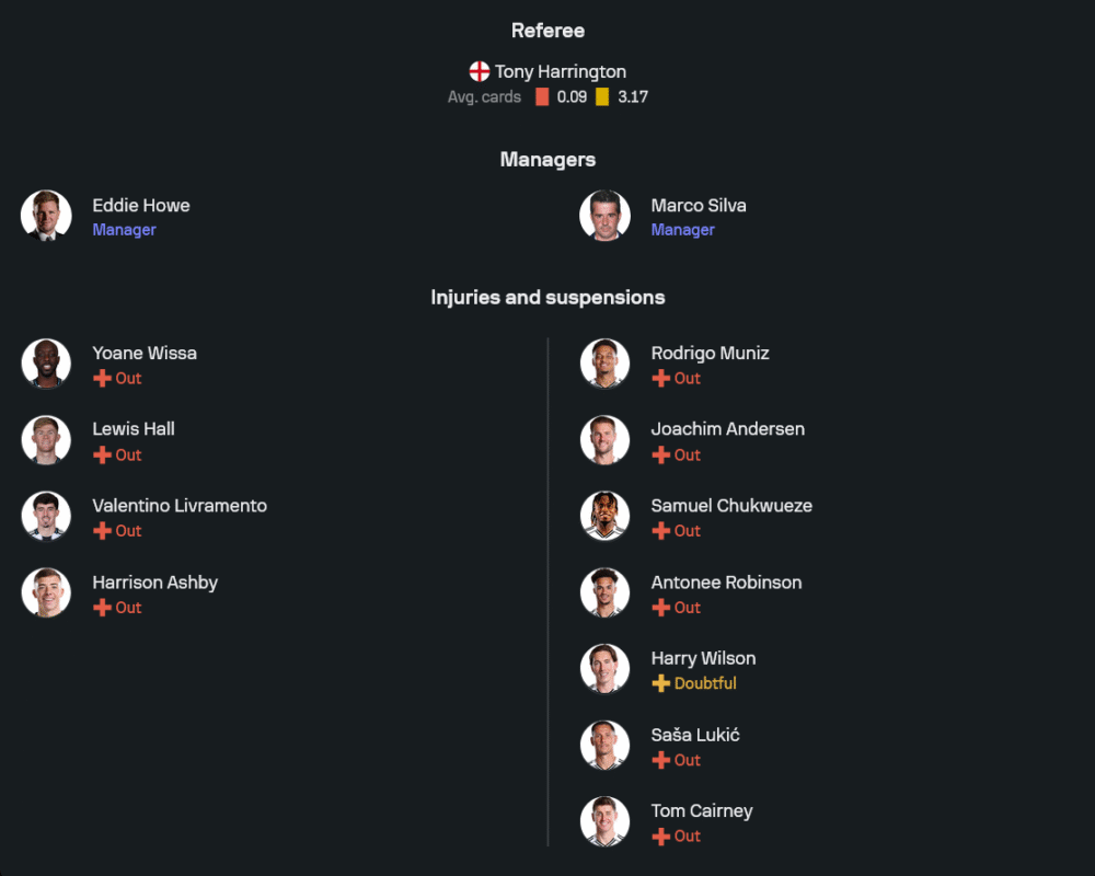 มาร์โก ซิลวา มาในสูตร 4-2-3-1 วางเกมรัดกุมหวังบุกฉกแต้ม นายด่าน แบร์นด์ เลโน่ พร้อมยืนเซฟช็อตสำคัญ แผงหลังประกอบด้วย ติโมธี กาสตาญ ยืนขวา คู่เซ็นเตอร์ อิสซ่า ดิย็อป จับคู่ แคลวิน บาสซี่ย์ และซ้ายเป็น ไรอัน เซสเซญง คู่กลางวาง แฮร์ริสัน รี๊ด จับคู่ ซานเดอร์ เบอร์เก้ สร้างสมดุลเกมรับ-รุก แถวสองใส่ความเร็วและลูกชิ่งสวยจาก แฮร์รี่ วิลสัน, จอช คิง และ อเล็กซ์ อิโวบี้ คอยสนับสนุนหน้าเป้าตัวเก๋า ราอูล ฆิมิเนซ ข้อจำกัดคือยังไร้ตัวหลักหลายรายทั้ง ทอม แคร์นี่ย์, โยอาคิม แอนเดอร์เซ่น, ซาซ่า ลูคิช, โรดริโก้ มูนิซ และ แอนโตนี่ โรบินสัน ที่เจ็บยาว ทำให้ตัวเลือกโรเตชันมีจำกัด