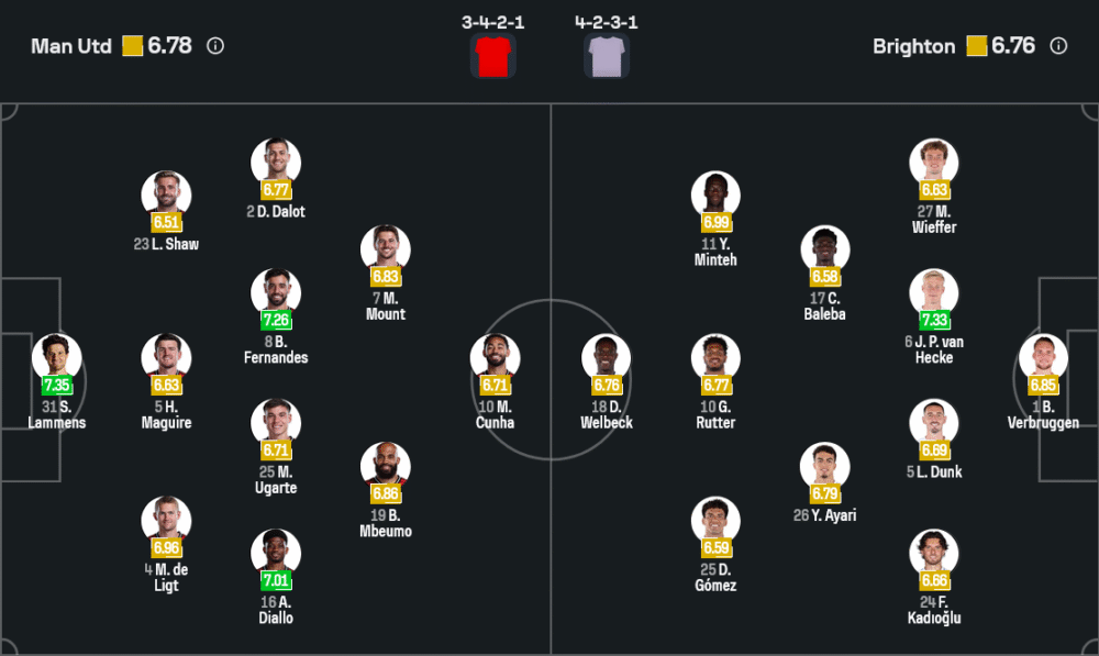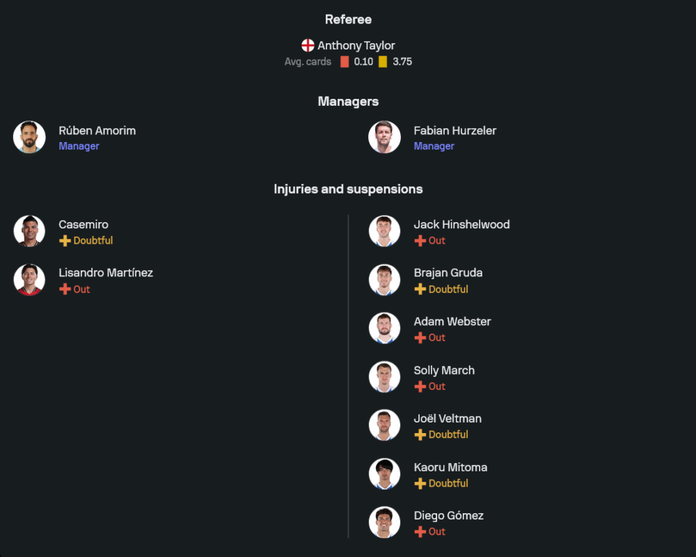 รูเบน อาโมริมยึดระบบหลังสามที่กำลังลงตัว นายด่านเป็น เซนเน่ ลัมเมนส์ คู่เซ็นเตอร์ใช้ มัตไตย์ส เดอ ลิกต์ คุมเกมร่วมกับ แฮร์รี่ แม็กไกวร์ และ ลุค ชอว์ ที่ขยับเข้ามาเป็นสต็อปเปอร์วิงซ้าย วิงแบ็กขวาเป็น อาหมัด ดิยัลโล่ เติมสปีดเกมริมเส้น ฝั่งซ้ายสลับขยับกับ ดิโอโก้ ดาโลต์ เมื่อจำเป็น กลางคู่ใจคือ มานูเอล อูการ์เต้ กับ บรูโน่ แฟร์นานเดส ที่ทำหน้าที่ทั้งคุมเทมโปและสาดบอลคิลเลอร์พาส แถวสองใส่ เมสัน เม้าต์ จับคู่ บรีย็อง เอ็มโบโม่ คอยเชื่อมสามเหลี่ยมร่วมกับหน้าเป้า มาเธอุส คุนญ่า ซึ่งกำลังมั่นใจ ส่วนสภาพทีมมีข่าวไม่สู้ดีนักเพราะ คาเซมิโร่ รอทดสอบความฟิต และ ลิซานโดร มาร์ติเนซ ยังเจ็บยาว แต่โดยภาพรวมขุมกำลังตัวจริงยังครบเครื่องพอไล่บี้ทีมเยือน
