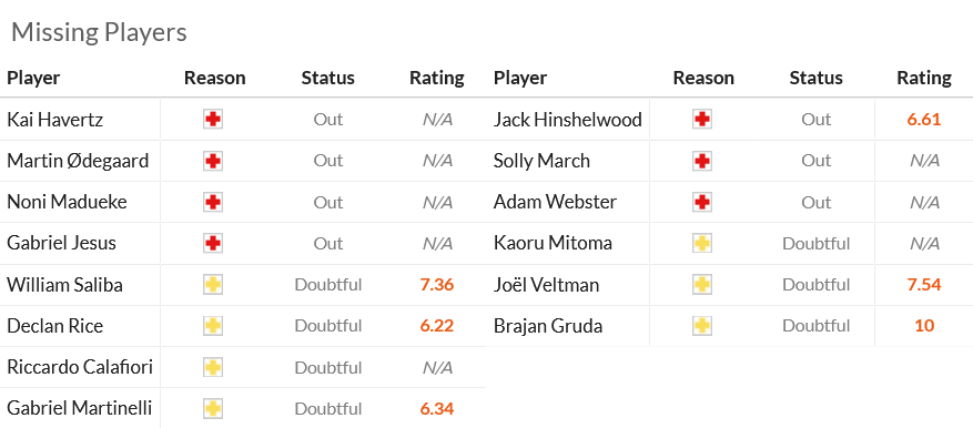 เจ้าบ้านของ มิเกล อาร์เตต้า เจอปัญหาผู้เล่นบาดเจ็บไม่น้อย ไล่ตั้งแต่ Kai Havertz, Martin Ødegaard, Noni Madueke, Gabriel Jesus ที่ต้องพัก รวมถึงตัวหลักอย่าง William Saliba, Declan Rice, Gabriel Martinelli ที่ยังต้องรอลุ้นความฟิตก่อนลงสนาม การจัดทัพวันนี้คาดว่าใช้ระบบ 4-2-3-1 นำโดย ทรอสซาร์, เอเซ่ และ ไวท์ ส่วนหน้าประตูวาง เกป้า อาร์ริซาบาลาก้า เป็นมือหนึ่ง
