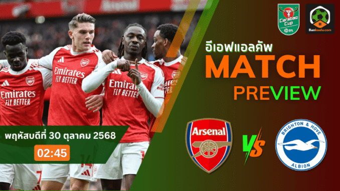 การแข่งขันฟุตบอล คาราบาวคัพ รอบ 4 คืนวันพฤหัสบดีที่ 30 ตุลาคม 2568 คู่บิ๊กแมตช์ที่หลายคนตั้งตารอ อาร์เซนอล เปิดบ้านต้อนรับการมาเยือนของ ไบรท์ตัน โฮฟ อัลเบี้ยน ที่สนามเอมิเรตส์ สเตเดี้ยม เวลา 02:45 น. ตามเวลาประเทศไทย โดยราคาบอลเปิดมาให้ อาร์เซนอลต่อ 1.25 ซึ่งถือว่าเป็นเรตที่สะท้อนความได้เปรียบชัดเจนของเจ้าถิ่น เกมนี้ถูกจับตามองจากทั่วโลก และแน่นอนว่าแฟนบอลสามารถเช็ก ตารางบอลวันนี้ กันได้ตั้งแต่หัวค่ำเพื่อไม่ให้พลาดศึกนี้