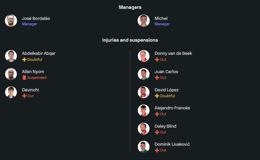 ลูกทีมของ โฆเซ่ บอร์ดาลาส กลับมามั่นใจหลังบุกเชือด แอธเลติก บิลเบา 1-0 ในเกมลีกล่าสุด สภาพทีมถือว่าดีขึ้นเยอะเมื่อได้ อัลลัน เอ็นยอม และ อเล็กซ์ ซานคริส พ้นโทษแบนกลับมาช่วยแนวรับ ส่วนตัวเจ็บยังมีเพียง ดาวินชี่ และ อับเดลคาบีร์ อับการ์ เท่านั้น เกมนี้คาดว่าจะมาในระบบ 3-4-2-1 โดยมี บอร์ฆา มายอรัล ยืนหอกเดี่ยว ขนาบข้างด้วย หลุยส์ มิย่า และ เมาโร อรัมบาร์รี คอยเชื่อมเกมจากแดนกลาง เกมนี้เจ้าถิ่นเน้นความแน่นอนและรัดกุมเป็นหลัก