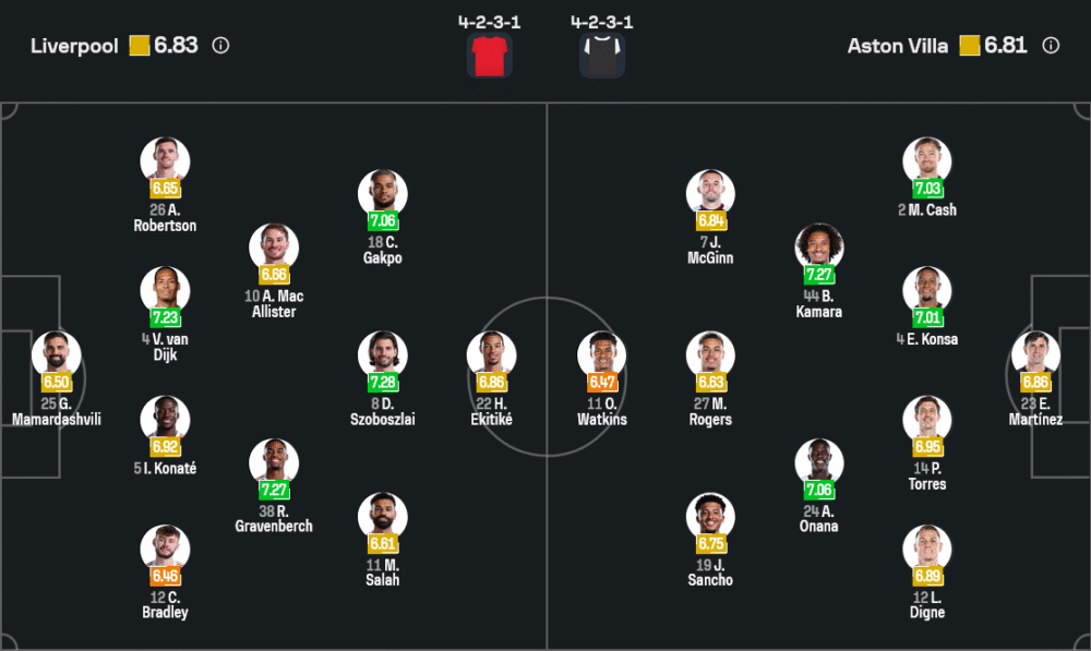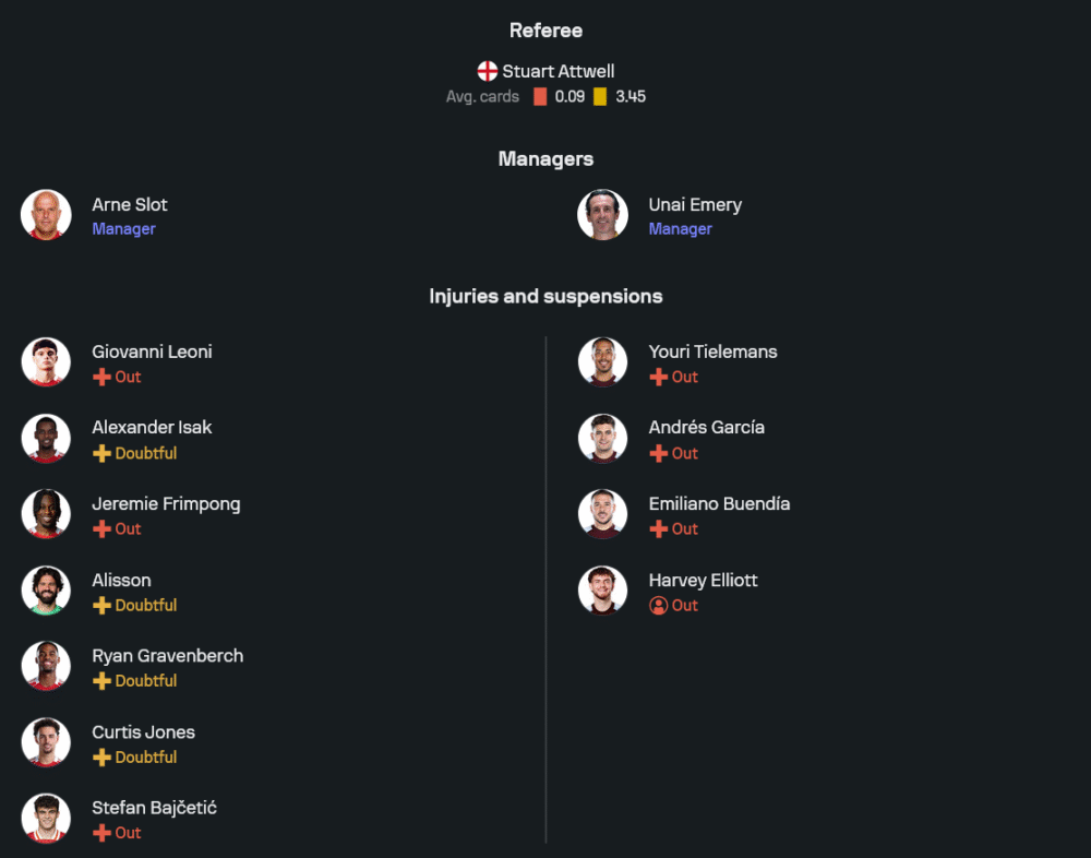 จากภาพไลน์อัปล่าสุด หงส์แดงยืนระบบถนัด 4-2-3-1 ผู้รักษาประตูเป็น จอร์จี้ มามาร์ดาชวิลี แนวรับสี่คน คอเนอร์ แบร็ดลีย์ ยืนแบ็กขวา คู่เซ็นเตอร์ อิบราฮิมา โกนาเต้ จับคู่ เฟอร์กิล ฟาน ไดค์ ด้านซ้ายเป็น แอนดรูว์ โรเบิร์ตสัน กลางคู่ใช้ อเล็กซิส แม็ค อัลลิสเตอร์ ผนึก ไรอัน กราเวนเบิร์ช สามตัวรุกวาง โมฮาเหม็ด ซาลาห์ ทางขวา ตรงกลางเป็น โดมินิค โซโบสไล ซัพพอร์ต โคดี้ กั๊คโป ทางซ้าย ส่วนหอกเป้าเป็น อูโก เอกิติเก้