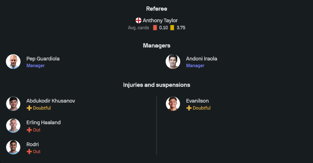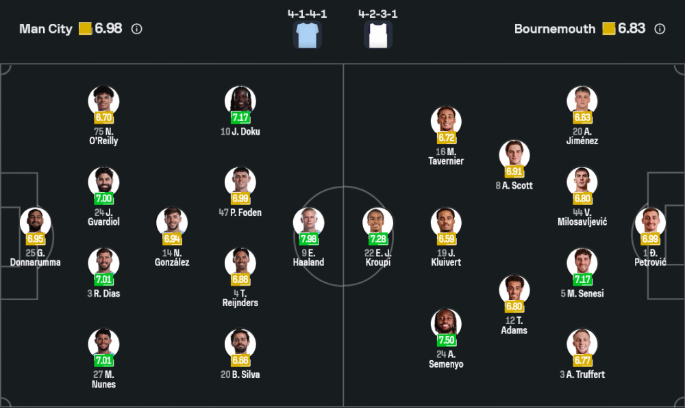 ภาพจากไลน์อัปล่าสุดชี้ว่าซิตี้ยืนระบบ 4-1-4-1 ใต้กรอบเขตโทษเป็น จานลุยจิ ดอนนารุมม่า เฝ้าเสา แผงหลังมี ยอสโก้ กวาร์ดิโอล จับคู่ รูเบน ดิอาส โดยมี มาเธอุส นูเนส ขึ้นเกมทางขวา ห้องเครื่องตัวคุมจังหวะวาง นิโก้ กอนซาเลซ คอยตัดเกมหน้าแผงแบ็ก ไลน์สี่ตัวรุกใช้ ฟิล โฟเด้น, ติยานี่ ไรย์นเดอร์ส, แบร์นาร์โด้ ซิลวา และ เจเรมี โดคู ที่พร้อมฉีกแนวรับด้วยสปีดและการเลี้ยงกินตัว ส่วนหน้าเป้าระเบิดตาข่ายคือ เออร์ลิ่ง ฮาลันด์ ที่ยืนค้ำหวังปิดบัญชีในกรอบเขตโทษ ความครบเครื่องของชุดนี้คือการเปลี่ยนสปีดจากกลางสู่พื้นที่สุดท้ายและความหลากหลายในการเข้าทำทั้งริมเส้นและช่องในฮาล์ฟส페ซ
