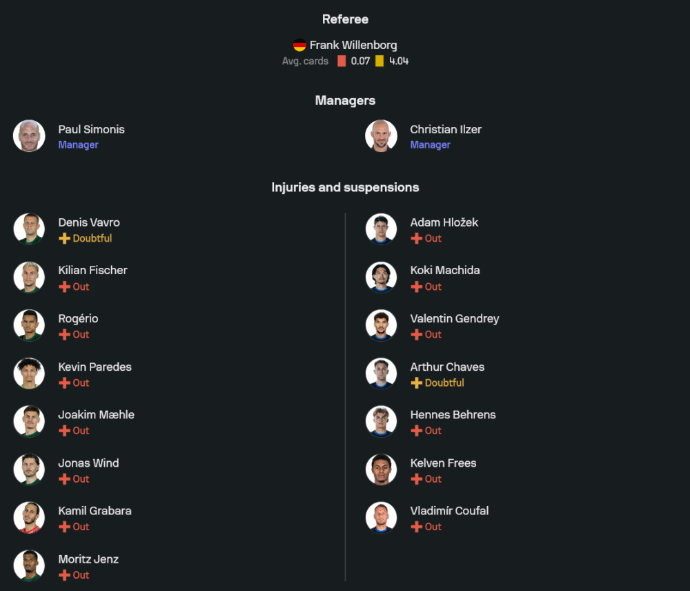 ฝั่งผู้มาเยือนของกุนซือคริสเตียน อิลเซอร์ จัดทัพเน้นความสมดุล ผู้รักษาประตูยังเป็น โอลิเวอร์ เบามันน์ ที่ไว้ใจได้ แผงหลังสอดประสานด้วย แบร์นาร์โด้, โรบิน ฮราแนค, ปีกที่ลงต่ำช่วยเกมรับอย่าง บาซูมาน่า ตูเร่ และฟูลแบ็กขยัน วลาดิเมียร์ คูฟาล คู่กลางอ่านเกมดีทั้งสองคนคือ เวาเตอร์ เบอร์เกอร์ กับ เลออน อัฟดูลลาฮู ส่วนแดนหน้าปล่อย ทิม เลมเพอร์เลอ ล่าตาข่ายร่วม ฟิสเนนิค อัสลานี ข้างสนามยังมีตัวโรเตชันพร้อมเติมสปีด ความอันตรายอยู่ที่ลูกเปลี่ยนแกนไวและการยิงนอกกรอบที่มักเข้ากรอบสูงกว่าค่าเฉลี่ย
