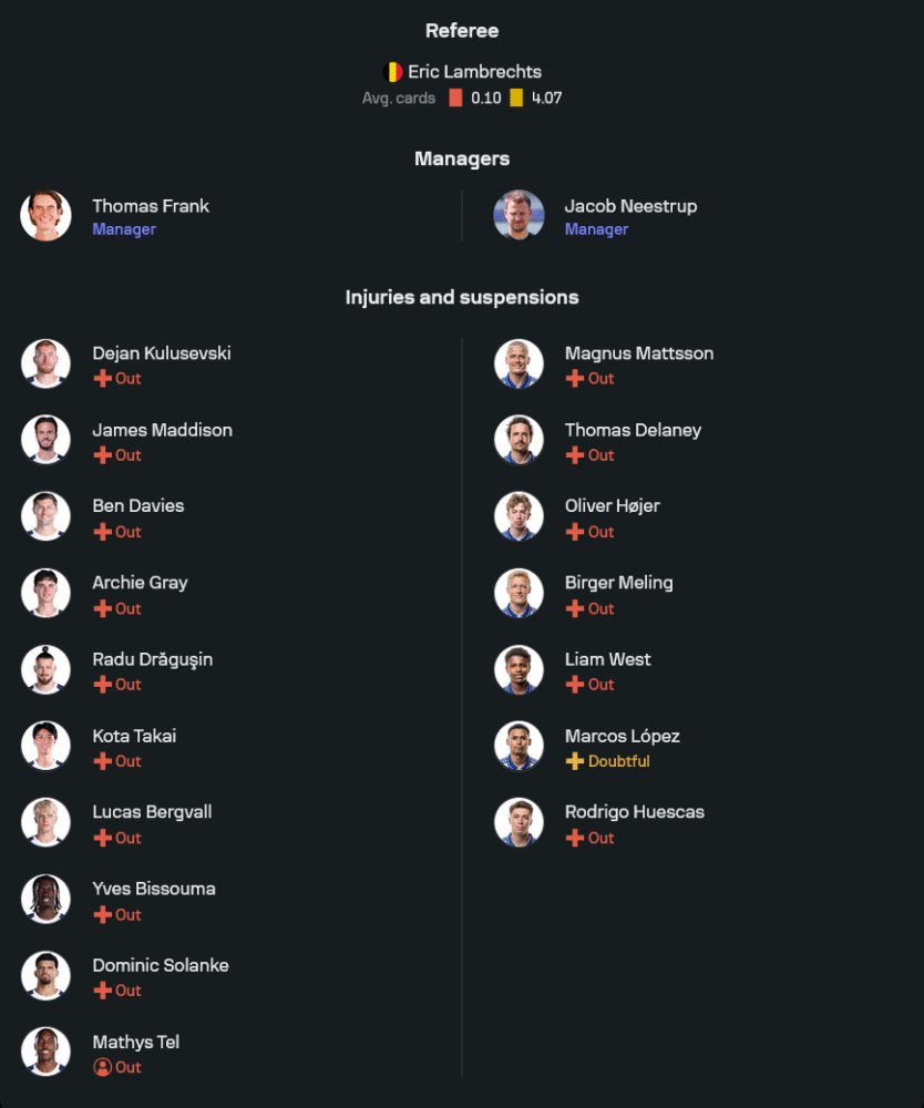 โธมัส แฟรงค์ นายใหญ่ชาวเดนมาร์กของสเปอร์ส เจอกับปัญหาใหญ่ในเรื่องอาการบาดเจ็บของผู้เล่นหลักหลายราย ทั้ง เดยัน คูลูเซฟสกี้, เจมส์ แมดดิสัน, โดมินิก โซลันเก้, อีฟส์ บิสซูม่า, อาร์ชี่ เกรย์ รวมถึงแนวรับอย่าง เบน เดวีส์ และ ราดู ดรากูซิน ที่ยังอยู่ในช่วงเรียกความฟิต แต่ข่าวดีคือแนวรับคนสำคัญอย่าง คริสเตียน โรเมโร่ กลับมาพร้อมคุมหลังบ้าน ส่วนแนวรุกจะฝากความหวังไว้ที่ ริชาร์ลิสัน หน้าเป้าชาวบราซิล โดยมี ซาบี ซิมอนส์, โมฮาเหม็ด คูดุส และ วิลสัน โอโดแบร์ สนับสนุนเกมรุกจากด้านหลัง ซึ่งทั้งหมดจะถูกขับเคลื่อนโดยคู่มิดฟิลด์อย่าง เชา เปาลินญ่า และ โรดริโก้ เบนตันกูร์ ที่เน้นการเชื่อมเกมรุกจากแดนกลางเป็นหลัก