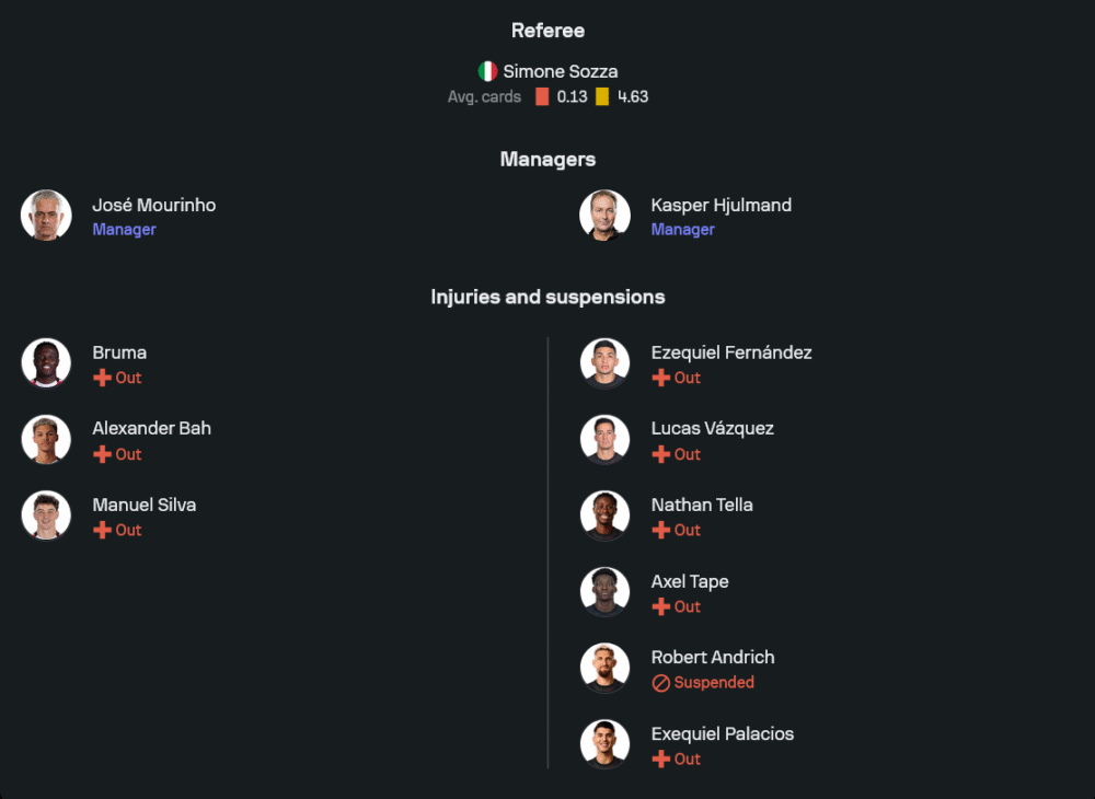 เลเวอร์คูเซ่น (3-4-2-1): มาร์ค เฟล็คเค่น – จาเรลล์ ควอนซ่าห์, ลออิก บาเด้, เอ็ดมงด์ ตัปโซบา – อาร์ตูร์, เคลาดิโอ เอเชเบร์รี่, อเล็กซ์ การ์เซีย, อเล็กซ์ กริมัลโด้ – คริสเตียน โกฟาเน่, เออร์เนสต์ โปกู – พาทริค ชิค