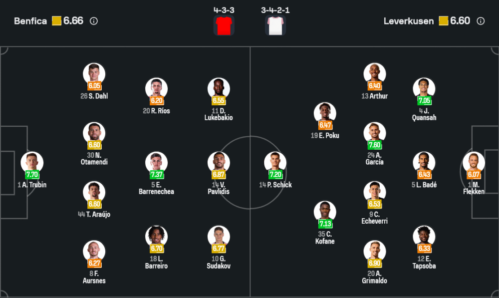เลเวอร์คูเซ่น ทีมเยือนที่คุมทีมโดย แคสเปอร์ ฮยูลมันด์ จะมาในแผน 3-4-2-1 โดยมี พาทริค ชิค เป็นตัวสำคัญในเกมรุก ขณะที่ อาร์ตูร์ และ เคลาดิโอ เอเชเบร์รี่ จะคอยคุมเกมในแดนกลางและช่วยสนับสนุนการโจมตีของทีม โดยมี อเล็กซ์ กริมัลโด้ และ อเล็กซ์ การ์เซีย คอยช่วยเกมรุกจากริมเส้น แนวรับจะต้องพึ่งพากองหลังตัวหลักอย่าง จาเรลล์ ควอนซ่าห์ และ ลออิก บาเด้ ที่จะคอยประสานงานกันในการป้องกันไม่ให้ เบนฟิก้า ทำประตูได้