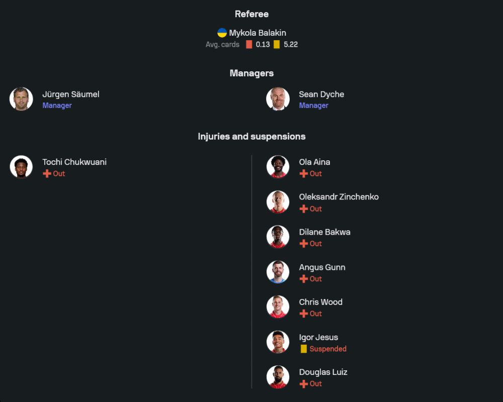 ลูกทีมของ ฌอน ไดช์ ยังคงจัดทัพชุดใหญ่ แต่ก็มีปัญหาผู้เล่นบาดเจ็บหลายราย ไม่ว่าจะเป็น โอล่า ไอน่า, โอเล็กซานเดอร์ ซินเชนโก้, ดิลาเน่ บัควา, และ ดั๊กลาส ลุยซ์ ที่ยังไม่พร้อมลงสนาม รวมถึง อิกอร์ เฮซุส ที่ติดโทษแบน อย่างไรก็ตามแนวรุกยังอันตรายสุดขีด มี ไตโว อโวนิยี่ ยืนหอกตัวเป้า โดยมีสามแนวรุกคอยสนับสนุนคือ แดน เอ็นดอย, มอร์แกน กิ๊บบ์ส-ไวท์, และ คัลลั่ม ฮัดสัน-โอดอย แดนกลางคุมเกมโดย อิบราฮิม ซ็องกาเร่ กับ เอลเลียต แอนเดอร์สัน ส่วนแนวรับมี มูริโญ่ กับ มิเลนโควิช ยืนคุมหลัง พร้อมนายด่านมือหนึ่ง มัตซ์ เซลส์