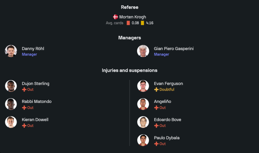 ลูกทีมของกุนซือหนุ่ม แดนนี่ โรห์ล จัดทัพในระบบ 3-4-2-1 ที่เน้นรับแน่นกลางสนามและเปลี่ยนสปีดขึ้นเกมรุกอย่างรวดเร็ว ผู้รักษาประตูมือหนึ่งยังคงเป็น แจ็ค บัตแลนด์ ที่โชว์เซฟสำคัญมาแล้วหลายเกม แผงหลังสามคนมี เดเร็ค คอร์เนเลียส ยืนคุมเกมร่วมกับ จอห์น ซูตทาร์ และ นาสเซอร์ ฌิก้า วิงแบ็กขวาคือกัปตันทีมคนสำคัญ เจมส์ ทาเวอร์เนียร์ ที่มีทีเด็ดเรื่องลูกตั้งเตะและการเติมเกมสูง ส่วนฝั่งซ้ายใช้ความสดของ จาเดน เมโกม่า กลางคู่กลางวาง โมฮาเหม็ด ดิโอม็องด์ จับคู่กับ นิโคลัส รัสกิ้น คอยบู๊และจ่ายบอลสองจังหวะ ด้านหลังหอกตัวเป้าเป็นสองตัวรุกจอมพริ้ว ดีออน กัสซาม่า กับ มาร์เลย์ มัวร์ คอยปั้นเกมสนับสนุนศูนย์หน้าหมายเลข 99 อย่าง ดานิโล ที่พร้อมยิงทุกจังหวะในกรอบเขตโทษ แม้ทีมยังมีตัวเจ็บอย่าง ดูจอน สเตอร์ลิง, แรบบี้ มาทอนโด้ และ เคียแรน โดเวลล์ แต่โดยรวมยังจัดว่ากำลังหลักแน่นพอเปิดศึกกับทีมใหญ่จากอิตาลี