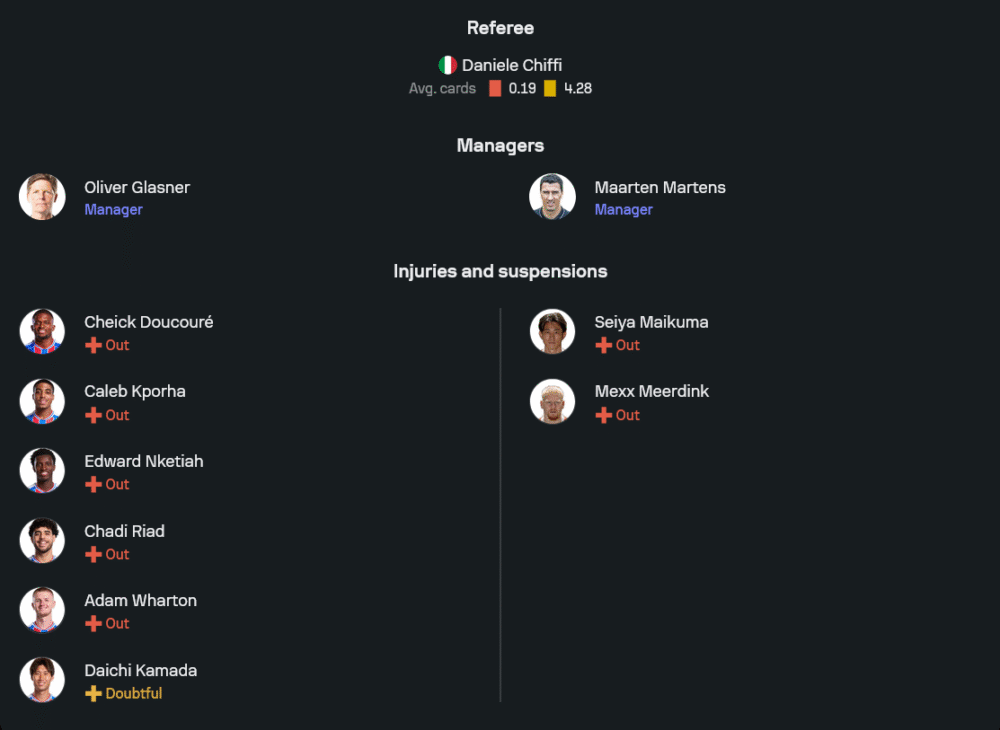 พาเลซยังหมดสิทธิ์ใช้งาน เชค ดูกูเร่, คาลเล็บ คอร์พาห์, เอ็ดดี้ เอ็นเคเทียห์ และ ชาดี ริอัด ที่อยู่ในลิสต์บาดเจ็บยาว ส่วน อดัม วอร์ตัน ต้องรอประเมินความฟิต โชคดีที่ไดอิจิ คามาดะ กลับมามีชื่อพร้อมสแตนด์บายหากกลาสเนอร์ต้องการความสร้างสรรค์เพิ่มในแดนกลาง