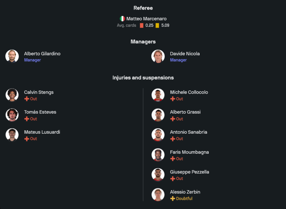 ลูกทีมของ อัลแบร์โต้ จิลาร์ดิโน่ อยู่ในสถานการณ์กดดันอย่างหนัก แม้จะเสมอทีมใหญ่ติดๆ กันทั้งลาซิโอและมิลาน แต่ปัญหาคือผ่านไป 10 นัดในลีกยังไม่ชนะใครเลย สภาพทีมจากข้อมูลล่าสุด ตัวเจ็บยังเป็นหน้าเดิมๆ ทั้ง คัลวิน สเตงส์, โตมาส เอสเตเวส และ มาเตอุส ลูซูอาร์ดี้ ทำให้ตัวเลือกในเกมริมเส้นและเกมรับบางลง แต่ขุมกำลังหลักที่ลงเล่นต่อเนื่องอย่างในภาพจัดตัวจากสถิติ Sofascore ยังอยู่ครบ