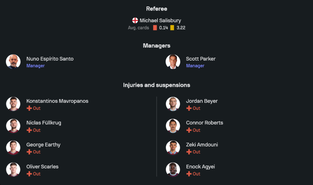 ทัพขุนค้อนของ นูโน่ เอสปิริโต้ ซานโต เริ่มปรับตัวกับระบบใหม่ได้ดีขึ้นเรื่อยๆ แม้คะแนนในตารางยังไม่สวย แต่ภาพรวมเกมล่าสุดที่เปิดบ้านอัดนิวคาสเซิล 3-1 ทำให้ความมั่นใจกลับมาเต็มถัง อย่างไรก็ตามสภาพทีมยังไม่สมบูรณ์ เมื่อขาดตัวหลักหลายราย ทั้ง คอนสแตนตินอส มาฟโรปานอส ปราการหลังจอมโหด, นิคลาส ฟูลล์ครู้ก หัวหอกเยอรมัน, จอร์จ เออร์ธี่ และ โอลิเวอร์ สคาร์เลส ดาวรุ่งสายเลือดค้อนที่เจ็บยาว