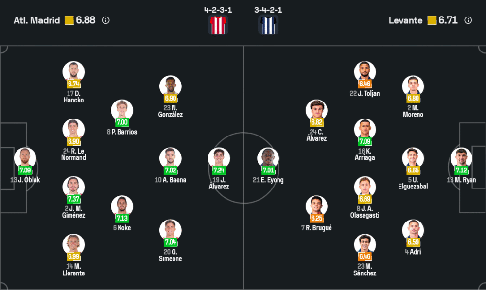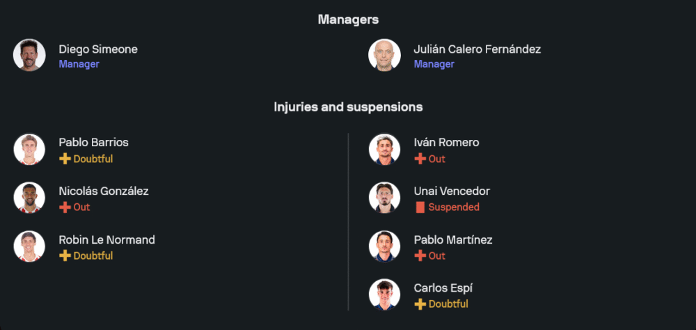 คาดว่าซิเมโอเน่จะจัดทัพในระบบ 4-2-3-1 ตามสไตล์ถนัด ยาน โอบลัก เฝ้าเสา แผงหลังจากขวาไปซ้ายใช้ มาร์กอส ยอเรนเต้ ยืนแบ็กขวา คู่เซ็นเตอร์เป็น โฆเซ่ ฆิเมเนซ กับ เลอ นอร์ม็องด์ หากผ่านเช็กฟิต ส่วนฝั่งซ้ายเป็น ดาวิด ฮานโช่ แดนกลางคู่รับวาง กาเบรียล ซิเมโอเน่ ลงคุมจังหวะเคียงข้าง ก๊อกเก้ กัปตันทีมจอมเก๋า
