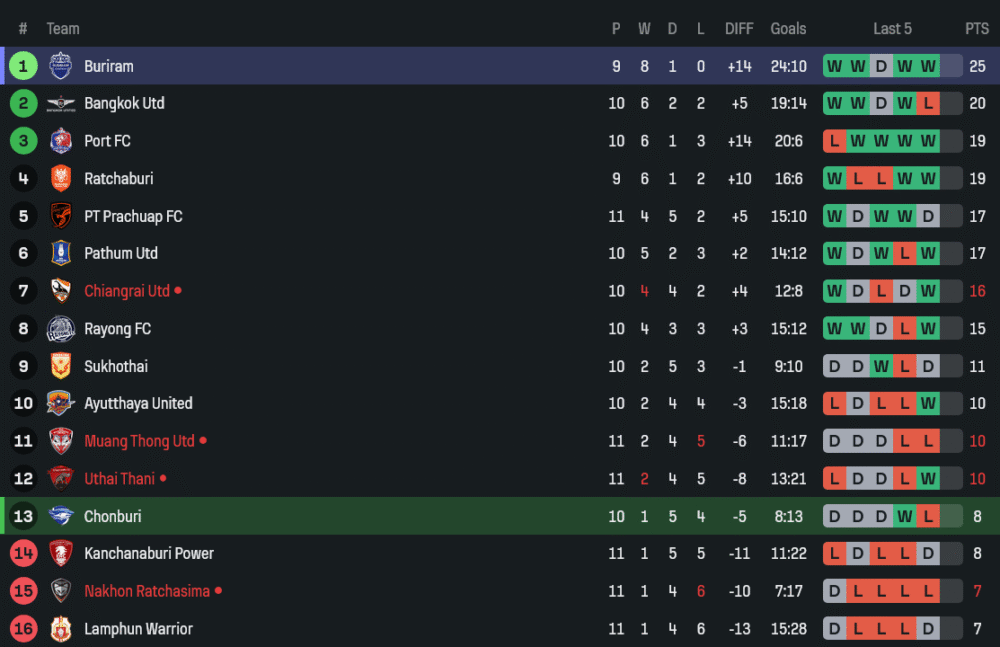 ผ่านไป 10 นัด เก็บได้เพียง 1 ชัยชนะ เสมอ 5 แพ้ 4 มีเพียง 8 ประตู และเสียไปถึง 13 ลูก ฟอร์มโดยรวมยังดูฝืด โดยเฉพาะเกมรุกที่ขาดความคม ส่วนเกมรับก็เสียประตูง่ายเกินไป จุดนี้ “Witthaya Laohakul” ต้องหาทางแก้หากหวังสร้างเซอร์ไพรส์ในบ้านตัวเอง เพราะตอนนี้ทีมอยู่เพียงอันดับ 12 ของตารางเท่านั้น