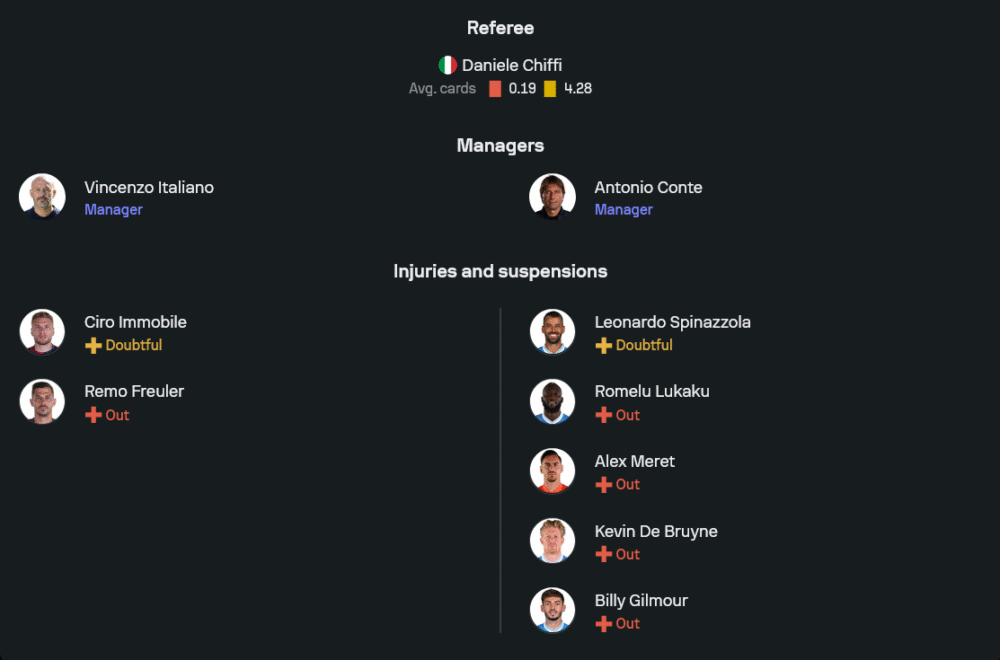 ฝั่งจ่าฝูงของคอนเต้ยังคงเล่นสไตล์บุกแหลกตามเครื่องหมายการค้า แม้จะมีปัญหาตัวเจ็บเพียบ ทั้ง โรเมลู ลูกากู, เควิน เดอ บรอยน์, อเล็กซ์ เมเร็ต และ บิลลี่ กิลมอร์ รวมถึงต้องลุ้นความฟิตของ เลโอนาร์โด สปินาซโซล่า แต่ขุมกำลังที่เหลือยังแน่นขนัด ผู้รักษาประตูใช้ วานย่า มิลินโควิช-ซาวิช แผงหลังให้ โจวานนี ดิ ลอเรนโซ ยืนแบ็กขวาคอยขึ้นจากเส้น พร้อมคู่เซ็นเตอร์อย่าง อามีร์ ราห์มานี จับคู่ อเลสซานโดร บวนจอร์โน โดยมี มาธิอัส โอลิเวรา ดูแลฝั่งซ้าย