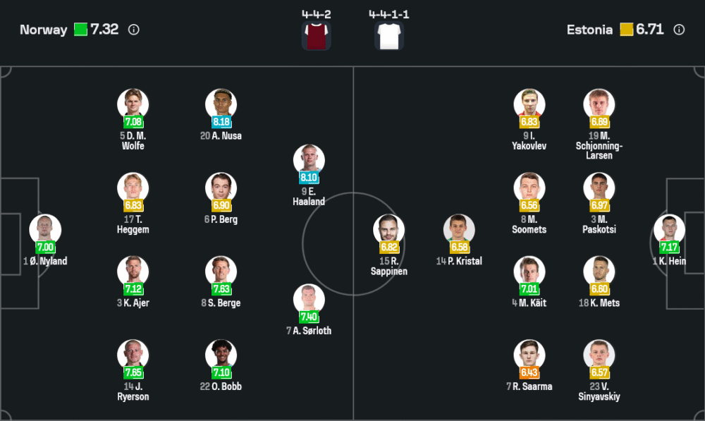ทีมของ สตาเล่ โซลบัคเค่น ใกล้จะจารึกประวัติศาสตร์ใหม่ ด้วยการพานอร์เวย์กลับไปเล่นบอลโลกรอบสุดท้ายเป็นครั้งแรกในรอบเกือบ 30 ปี เกมนี้พวกเขาจะยังไม่มี มาร์ติน โอเดการ์ด กัปตันทีมจากอาร์เซน่อลที่ยังไม่หายเจ็บหัวเข่า แต่ตัวแทนในแดนกลางยังคงแน่นปึ้กทั้ง ซานเดอร์ แบร์เก้, พาทริค เบิร์ก และดาวรุ่งพุ่งแรงจากแมนซิตี้ ออสการ์ บ็อบบ์ ที่พร้อมประสานงานกับแนวรุกระดับโลกอย่าง เออร์ลิ่ง ฮาแลนด์ และ อเล็กซานเดอร์ เซิร์ลอธ ส่วนริมเส้นจะมี อันโตนิโอ นูซ่า และ เดวิด วูล์ฟ ที่พร้อมทะลวงแนวรับเอสโตเนียทุกเมื่อ