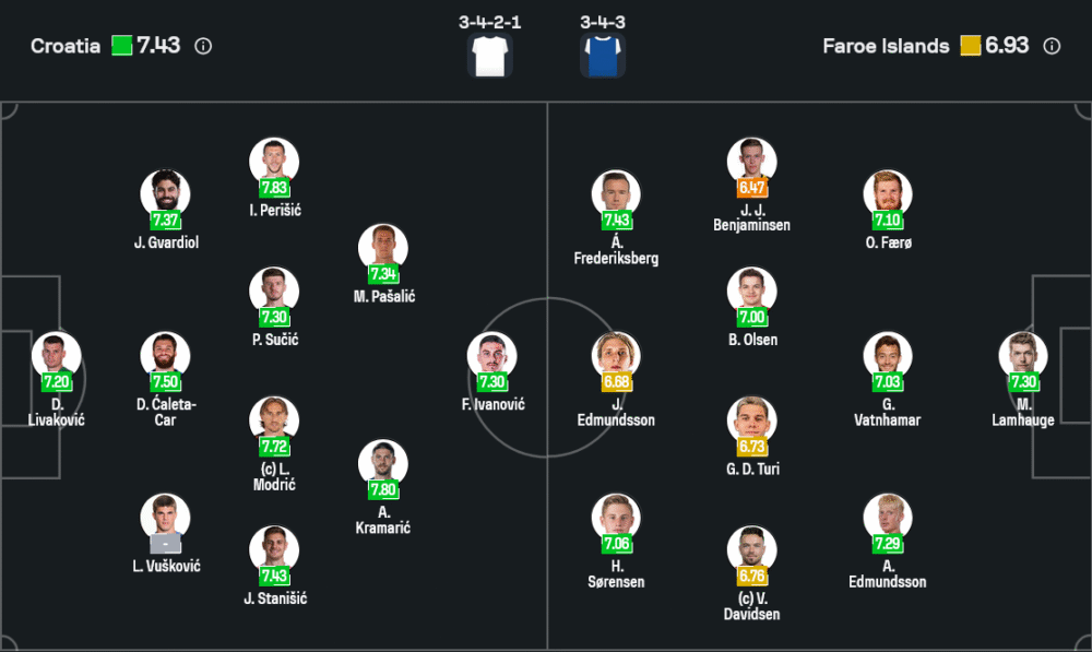 จากภาพจัดตัวล่าสุดในระบบ 3-4-2-1 ของโครเอเชีย ดาเลอร์ ซลัตโก้ ดาลิช วาง โดมินิค ลิวาโควิช เฝ้าเสา แผงหลังสามคนใช้ ยอชโก้ กวาร์ดิโอล, ดูเย่ ชาเลต้า คาร์ และ โยซิป สตานิซิช วิงแบ็กซ้ายเป็น อิวาน เปริซิช ขวาเป็น โยซิป วูชโควิช กลางสนามมี ลูก้า โมดริช คุมจังหวะร่วมกับ มาริโอ ปาซาลิช ขณะที่สองตัวรุกด้านหลังหน้าเป้าเป็น พาสาลิชที่ดันสูงกับ ลอฟโร่ มายเออร์ ป้อนบอลให้ ฟรานโย่ อิวาโนวิช ยืนเป็นหอกเดี่ยว