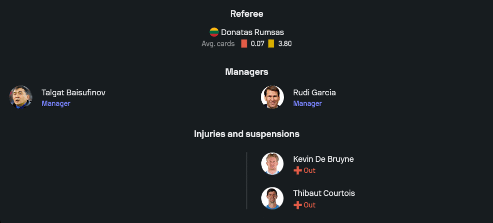 ฝั่งปีศาจแดงแห่งยุโรปของ รูดี้ การ์เซีย แม้จะขาดสองหัวใจหลักอย่าง เควิน เดอ บรอยน์ และ ติโบต์ กูร์กตัวส์ ที่เดี้ยงยาว แต่ขุมกำลังที่เหลือยังถือว่าแน่นและอันตรายสุด ๆ โดยแนวรุกเป็นตัวจี๊ดอย่าง เฌเรมี่ โดกู (คะแนน 8.05) และกองหน้าอาร์เซน่อลฟอร์มสดอย่าง เลอันโดร ทรอสซาร์ (คะแนน 7.10) ยืนล่าสกอร์ ส่วนกลางรุกมี ชาร์ลส์ เดอ เคเตแลร์ และ ฮานส์ ฟานาเค่น โยกเกมรุกสร้างสรรค์โอกาส แผนระบบชัดเจนเช่นกันในรูปแบบ 4-2-3-1 เน้นเข้าทำเร็วและวิ่งกดดันแนวรับเจ้าถิ่นตั้งแต่ต้นเกม