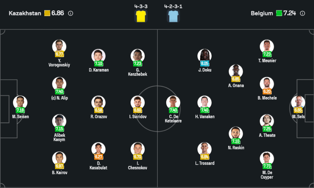 ทัพเจ้าถิ่นของกุนซือ ตัลกัต ไบซูฟินอฟ เจอปัญหาขุมกำลังพอสมควร โดยผู้รักษาประตูมือหนึ่งอย่าง อเล็กซานเดอร์ ซารุตสกี้ ยังเดี้ยง รวมถึงตัวริมเส้นบางรายที่หลุดทีมเพราะอาการบาดเจ็บ แต่แกนหลักที่เหลือยังนำโดยกัปตัน นูราลี อาลิป กองหลังที่ได้คะแนน 7.40 จากฟอร์มล่าสุดในภาพ Sofascore ด้านเกมรุกมี ดาสตัน สัตปาเยฟ ยืนหน้าเป้า พร้อมด้วยแผงจอมทัพอย่าง อีวาน สวิริดอฟ และ อิสลาม เชสโนคอฟ ที่มีความเร็วและการหาช่องเป็นอาวุธสำคัญ นัดนี้คาซัคสถานจัดระบบ 4-3-3 สู้แบบรัดกุม หวังใช้แฟนบอลในบ้านกดดันคู่แข่ง
