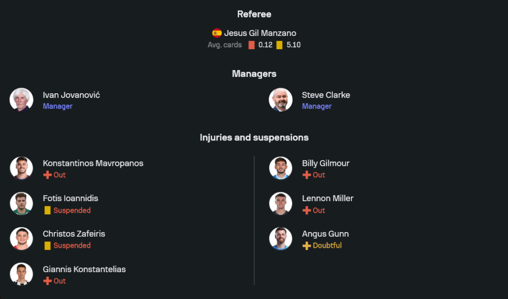 ทีมของ อิวาน โยวาโนวิช ต้องเจอข่าวร้ายต่อเนื่องจากปัญหาตัวเจ็บและติดโทษแบน ตามรายชื่อในภาพ Sofascore เห็นชัดว่าพวกเขาจะไม่มี คอนสแตนตินอส มาฟโรปาโนส ปราการหลังตัวหลัก รวมถึง จานนิส คอนสแตนเตเลียส, โฟติส โยอันนิดิส และคริสตอส ซาเฟียร์ริส ที่ถูกตัดออกจากทีมชุดนี้จากทั้งอาการบาดเจ็บและโทษแบน ทำให้ขุมกำลังดูบางลงอย่างเห็นได้ชัด