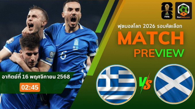 คืนวันอาทิตย์ที่ 16 พฤศจิกายน 2568 เวลา 02.45 น. สนามจอร์จอส คาไรสคาคิส สเตเดี้ยมในกรุงเอเธนส์จะลุกเป็นไฟ เมื่อชาติลูกหนังเจ้าเล่ห์อย่าง กรีซ เปิดรังรับการมาเยือนของนักสู้เลือดสกอตอย่าง สกอตแลนด์ ในศึก ฟุตบอลโลก 2026 รอบคัดเลือก คัดบอลโลกโซนยุโรป กลุ่มซี เกมนี้เจ้าถิ่นได้เปรียบแฟนบอลแน่นสนาม แต่ฟอร์มในกลุ่มกลับสะดุดจนต้องดิ้นเฮือกสุดท้าย ขณะที่ทีมเยือนทำผลงานยอดเยี่ยม มีลุ้นเบียดเดนมาร์กขึ้นจ่าฝูงหากเก็บสามแต้มได้