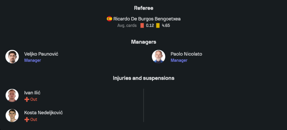 ภาพไลน์อัพจาก Sofascore ชี้ชัดว่า เวลย์โก ปาอูโนวิช กุนซือเจ้าถิ่นจัดเต็มเท่าที่มี แม้จะไร้ชื่อ อิวาน อิลิช ห้องเครื่องจากโตริโนที่เดี้ยงจากเกมล่าสุด แต่คีย์แมนส่วนใหญ่ยังอยู่กันครบ ระบบที่ใช้คือ 4 2 3 1 ผู้รักษาประตูเป็น เปรแดร็ก ไรย์โควิช แผงสี่กองหลังเรียงจากซ้ายไปขวา อเล็กซานดาร์ เตอร์ซิช ยืนแบ็กซ้าย คู่เซ็นเตอร์ใช้ สตราฮินยา ปาฟโลวิช จับคู่กับ นิโคล่า มิลเลนโควิช ส่วนแบ็กขวาเป็น ออเล็กซานดาร์ มิโมวิช ที่เติมเกมบุกได้ดี