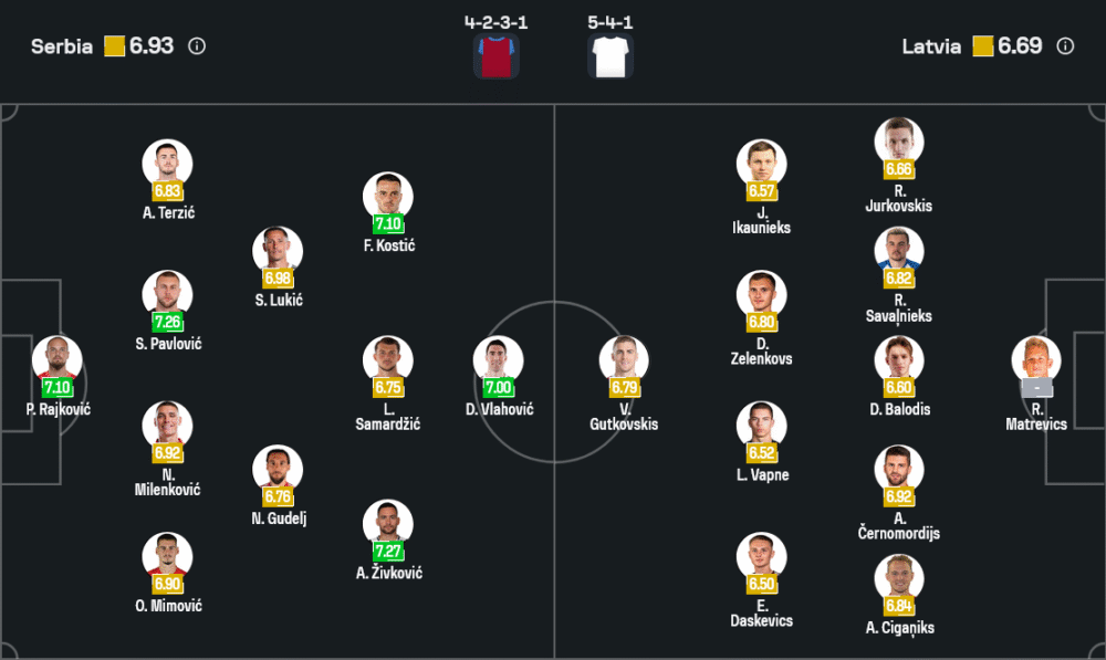 ฝั่งทีมเยือน เปาโล นิโคลาโต้ กุนซือลัตเวียรู้ดีว่าการบุกมาเยือนเซอร์เบียไม่ใช่งานง่าย เขาจึงจัดทัพในระบบ 5 4 1 เน้นรอโต้มากกว่าดันสูง เกมนี้ใช้ วลาดิสลาฟ กัตคอฟสกิส ดาวยิงตัวความหวังยืนหน้าเป้าคนเดียว ข้างหลังเป็นกำแพงหลังห้าคน นำโดยคู่เซ็นเตอร์ตัวหลัก ดานิเอล บาโลดิส กับ อันโตนิจส์ เชร์นอร์มอร์ดิจส์ ที่ต้องเจองานช้างอย่างวลาโฮวิชทั้งเกม ริมเส้นสองฝั่งมี เอดการ์ส ดัสเควิช กับ อัลวิส ซิแกนิกส์ คอยวิ่งเติมและช่วยปิดช่องข้างสนาม
