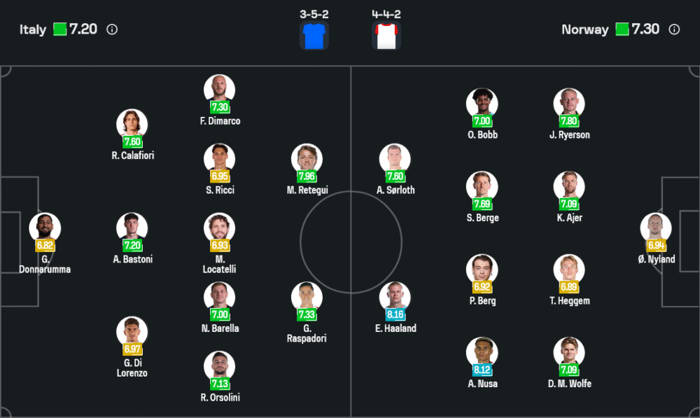 อิตาลีภายใต้ระบบ 3 5 2 จะพยายามกดดันจากแดนกลาง ใช้ความขยันของบาเรลลาและโลคาเตลลี่วิ่งบีบพื้นที่ ลดโอกาสที่บอลจะถูกแทงเข้าเท้าฮาลันด์โดยตรง ขณะเดียวกันวิงแบ็กทั้งสองฝั่งจะคอยเปิดบอลเข้าใส่หลังบ้านนอร์เวย์ที่แม้แข็งแกร่ง แต่เคยถูกเล่นงานด้วยลูกครอสและจังหวะสองมาแล้วหลายครั้ง จุดสำคัญคือการเปลี่ยนจังหวะจากรับเป็นรุกของเรเตกีกับราสปาโดรี หากทั้งคู่จับมือกันหาพื้นที่ระหว่างไลน์ได้ เกมรับนอร์เวย์มีสิทธิ์ปั่นป่วน