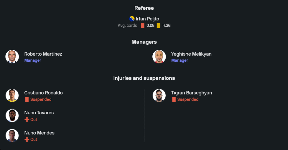 เยกิช เมลิกยาน พาทีมมาเยือนแบบไม่มีอะไรจะเสีย เพราะตกรอบไปแล้วอย่างสมบูรณ์ ความพร้อมไม่เต็มเหมือนฝั่งเจ้าบ้าน เพราะขาดผู้เล่นหลายรายรวมถึงศูนย์หน้าคีย์แมนอย่าง ทิกราน บาร์เซกห์ยาน ที่ติดแบนต่อเนื่อง แต่แนวรุกยังมี เอ็ดการ์ เซวิกยาน, แกรนต์-ลีออน รานอส และ ซีร์ราย่า ชาโกยาน ที่พร้อมวิ่งสู้ฟัด แดนกลางมอบความหวังให้ คาเรน มูรัดยาน และ เอดูอาร์ด สเปียร์ซยาน คอยสกัดเกมรุกโปรตุเกส ส่วนแนวรับนำโดย เฮนรี อาวากยาน นายทวารที่น่าจะเหนื่อยตั้งแต่เขี่ยลูกแรก