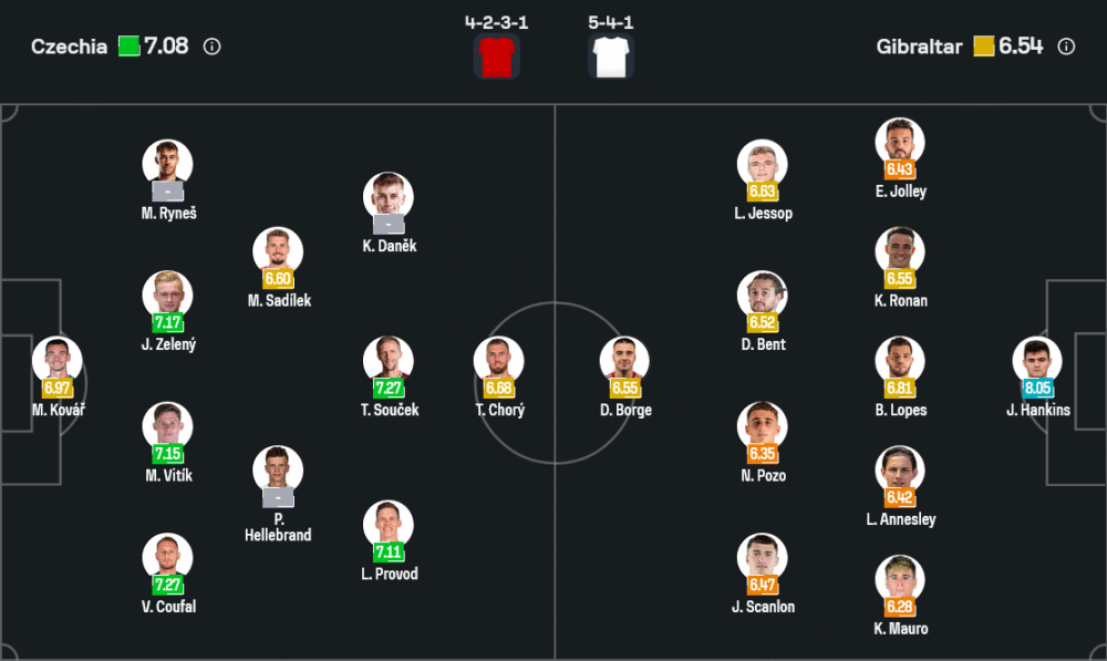 กองทัพเช็กภายใต้การคุมทีมของ ยาโรสลาฟ คอสต์ล ยืนพื้นระบบ 4-2-3-1 ใส่ตัวจริงอย่าง โควาร์, คูฟาล, วีติก, โฮริ, โซชีค และ เฮลเลแบรนด์ ลงคุมเกม ส่วนตัวยิงต้องฝากความหวังไว้ที่ ทอมาช โชรี่ ที่ยืนหน้าเป้า ส่วนฝั่งยิบรอลตาร์ของ สก็อต ไวส์แมน วางหมาก 5-4-1 ตั้งรับลึกแบบอดทน โดยมี แฮงกิ้นส์ นายด่านที่ได้คะแนนสูงสุดจาก Sofascore ยืนเฝ้าเสาเพื่อหวังหยุดเกมรุกสุดโหดของเจ้าถิ่น