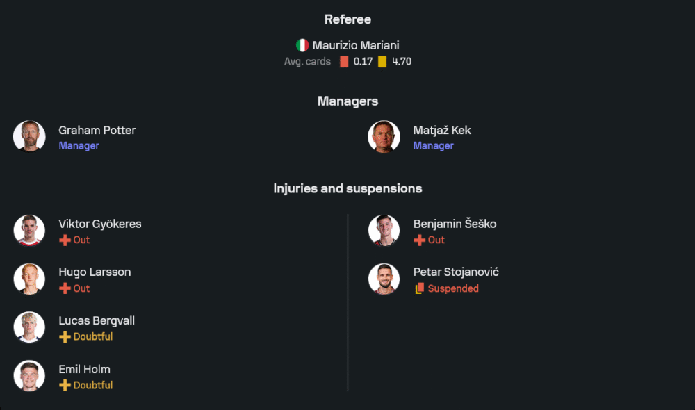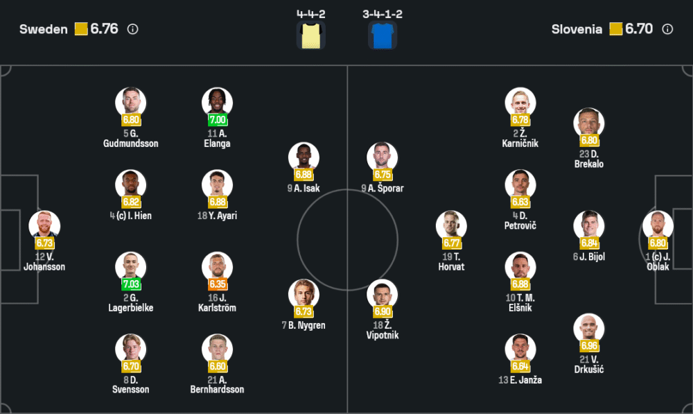 จากภาพไลน์อัพล่าสุด สวีเดนยุคพ็อตเตอร์วางแท็กติก 4-4-2 เน้นเกมรุกริมเส้นและสปีดของแนวรุกคู่หน้า โกลใช้ โยฮันส์สัน เฝ้าเสา แผงหลังเรียงหน้าจากซ้ายไปขวาเป็น กาเบรียล กุ๊ดมุนด์สสัน, ลาเกอร์บิลเค, คาร์ลสตรอม และ สเวนส์สัน แดนกลางสี่คนมี แบร์นฮาร์ดส์สัน ประจำการริมเส้นขวา อีกฝั่งเป็น อ็องโธนี่ เอลังกา ส่วนคู่กลางใช้ ยาซิน อายาริ จับคู่กับจอมเก๋า ฮีน ให้คอยเชื่อมเกมระหว่างรับกับรุก คู่หน้าใช้ เบนจามิน นีเกรน เล่นเข้าขากับดาวยิงตัวเก่งอย่าง อเล็กซานเดอร์ อิซัก ที่พร้อมสร้างปัญหาให้แนวรับทีมเยือนตลอด 90 นาที แม้จะขาดกองหน้าสำคัญอย่าง วิคตอร์ ไกอ็อเคเรส และมิดฟิลด์พลังหนุ่ม ฮูโก ลาร์สสัน ที่เจ็บ รวมถึง ลูคัส แบร์กวัลล์ กับ เอมิล โฮล์ม ที่ยังต้องเช็กความฟิต แต่โครงสร้างหลักของทีมก็ยังดูแน่นและมีทางเลือกในแดนกลางให้หมุนเวียน