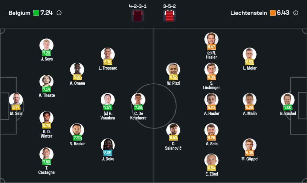 ลิกเตนสไตน์รู้ตัวดีว่าหากเปิดหน้าแลกคือจบเห่ พวกเขาจึงน่าจะยืนโซนต่ำ ปิดพื้นที่แดนกลาง ปล่อยให้เบลเยียมต่อบอลหน้าเขตโทษแล้วค่อยหาจังหวะบล็อกและเคลียร์ทิ้ง เป้าหมายหลักคือแพ้ให้น้อยที่สุด ไม่ให้ภาพออกมาน่าเกลียดเหมือนนัดแรกที่โดนยิงหกเม็ด เกมนี้แนวรับทั้งสามคนจะยืนต่ำกว่าปกติ ขณะที่วิงแบ็กสองฝั่งถอยมาปิดช่องด้านข้างของ โดกู และ ทรอสซาร์ด เพื่อลดความเร็วของเกมริมเส้น
