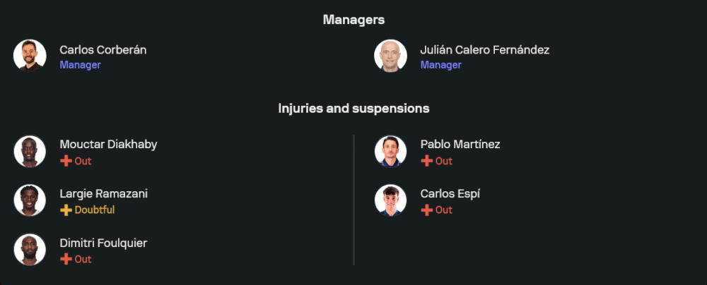 เจ้าบ้านภายใต้การคุมทีมของคาร์ลอส คอร์เบราน ต้องรับมือกับปัญหาตัวเจ็บหลายรายเหมือนเดิม ทั้ง มุคตาร์ ดิยาคาบี้, ดิมิทรี ฟูลกิเยร์ และ ฟิลิป อูกรินิช ที่ยังต้องพักยาว ขณะที่ ลาร์กี้ รามาซานี ปีกตัวจี๊ดอยู่ในสถานะเช็กฟิตก่อนเกม แต่จากภาพรวมแล้วขุมกำลังหลักยังอยู่ครบ คอร์เบรานมีแนวโน้มจัดทัพในระบบ 4-2-3-1 ตามที่ใช้ในหลายเกมหลัง ผู้รักษาประตูเป็น ฆูเลน อากิร์เรซาบาล่า แผงหลังสี่คนประกอบด้วย โฆเซ่ กาย่า ยืนแบ็กซ้าย คู่เซ็นเตอร์ใช้ ฆาบิ ตาร์เรก้า จับคู่กับ โฆเซ่ โกเปเต้ ส่วนแบ็กขวาเป็น เธียร์รี กอร์เรอา