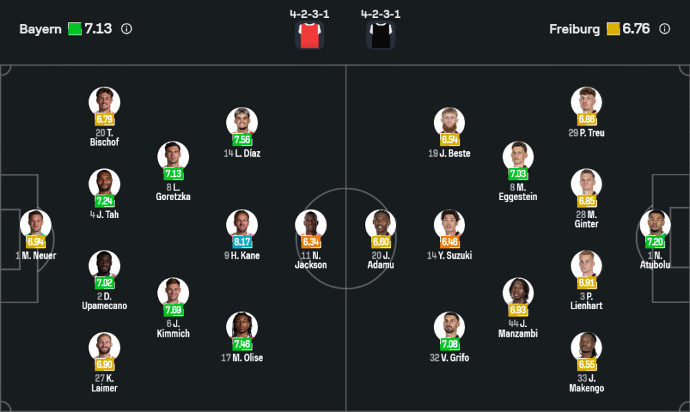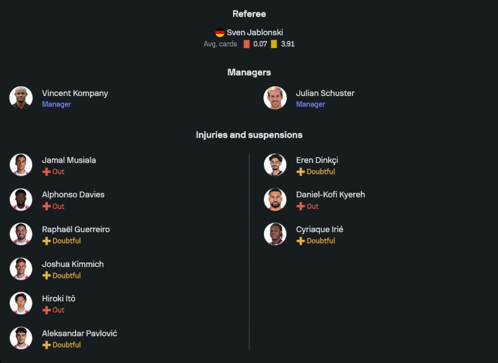 แม้จะมีตัวเจ็บ แต่ขุมกำลังที่เหลือยังดูน่าเกรงขาม ระบบหลักน่าจะยังยึด 4-2-3-1 ตามที่ใช้ในเกมใหญ่ก่อนหน้า มานูเอล นอยเออร์ เฝ้าเสา แนวรับสี่คนใช้ ทิม บิสชอฟ, โจนาธาน ทาห์, ดาโยต์ อูปาเมกาโน่ และคอนราด ไลเมอร์ คุมพื้นที่ กลางคู่เป็น โยชัว คิมมิค จับคู่กับ เลออน โกเร็ตซ์ก้า ช่วยกันทั้งตัดเกมและออกบอล ส่วนสามตัวรุกด้านหลังหอกหน้าเป้าจัด หลุยส์ ดิอาซ ทางซ้าย ไมเคิล โอลิเซ่ ทางขวา ขณะที่ตรงกลางให้ นิคลัส แจ็คสัน ทำเกมอยู่หลัง แฮร์รี เคน ศูนย์หน้าตัวความหวังที่ยิงกระจายตั้งแต่เปิดฤดูกาล